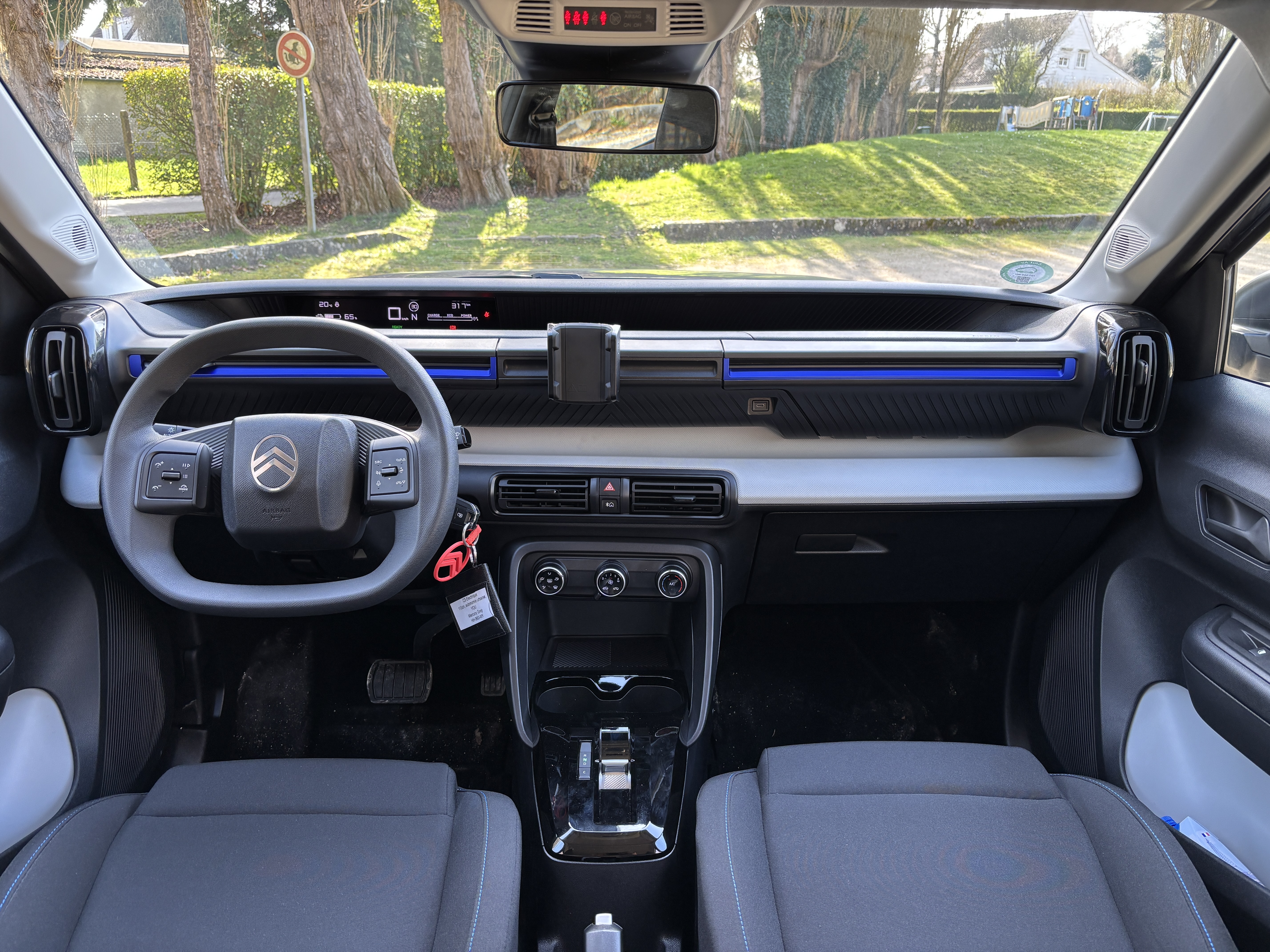 Une fois la voiture enregistrée avec le VIN sur l’application (gratuite), il faut appairer le smartphone en Bluetooth et le lier à la voiture via le capteur NFC placé sur le support. Une fois cette manipulation effectuée (une seule fois), le smartphone donne accès à plusieurs fonctionnalités comme l’état de charge, les périodicités d’entretien, la navigation via Waze et la radio. Car si la C3 est équipée de haut-parleurs, elle ne dispose pas d’autoradio. Donc si votre smartphone est à plat, vous n’aurez pas de radio. Cela dit, l’application a fonctionné plutôt correctement durant notre essai. Citroën a réalisé des économies absolument partout, si bien que sur cette finition « You », dépourvue d’écran tactile, l’affichage de l’heure est inexistant. Le compteur numérique affiche plusieurs informations, mais pas l’heure.