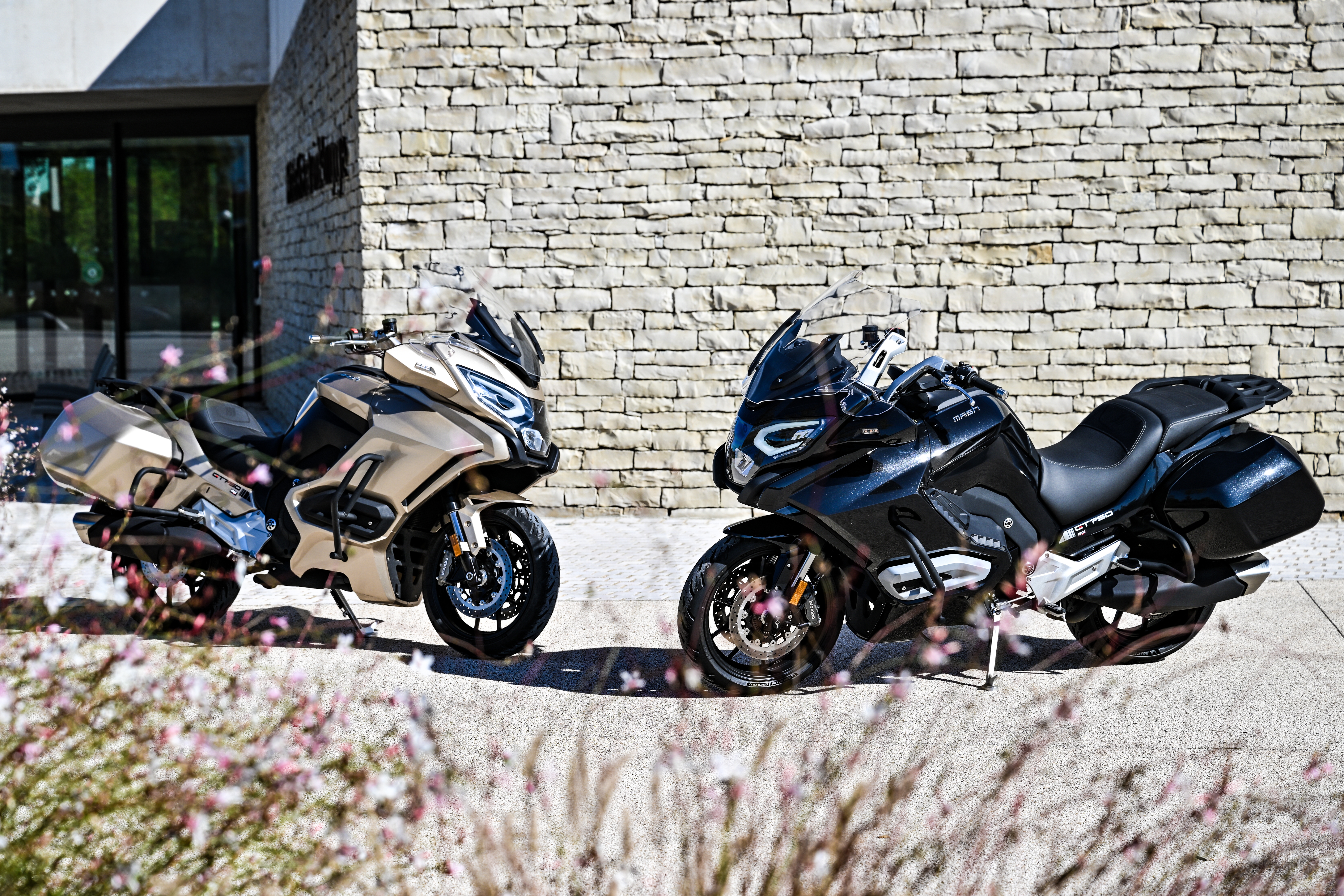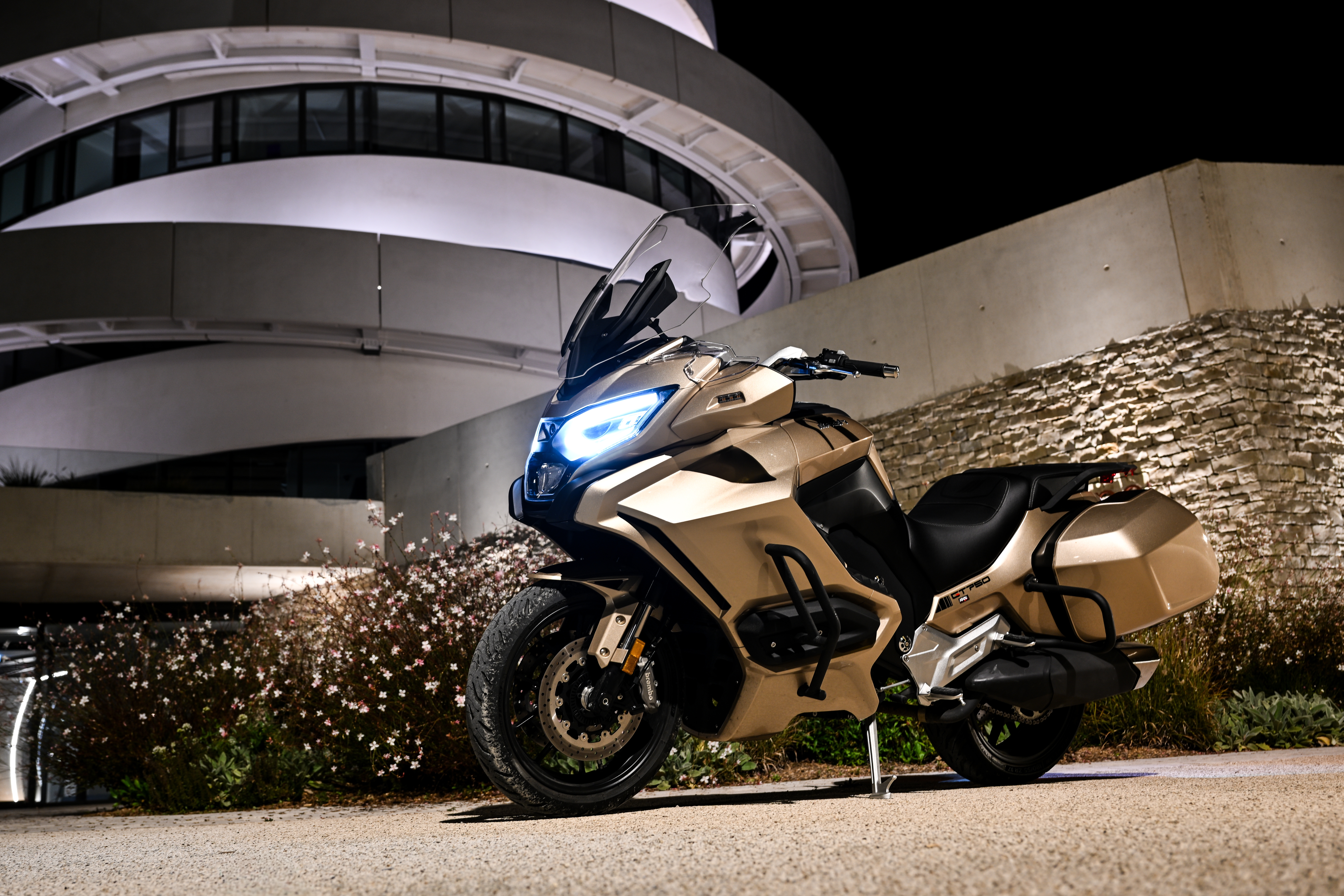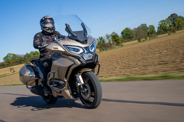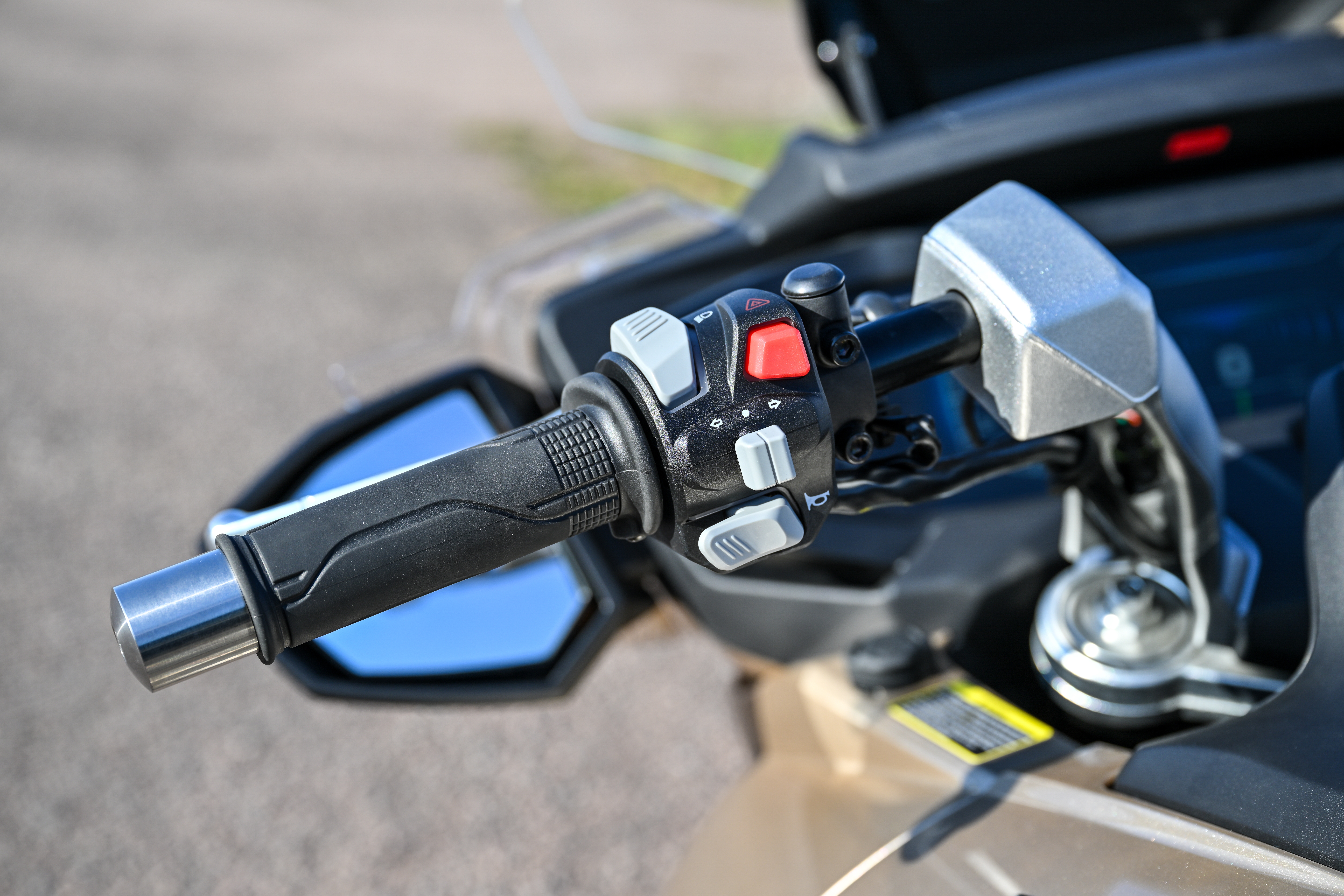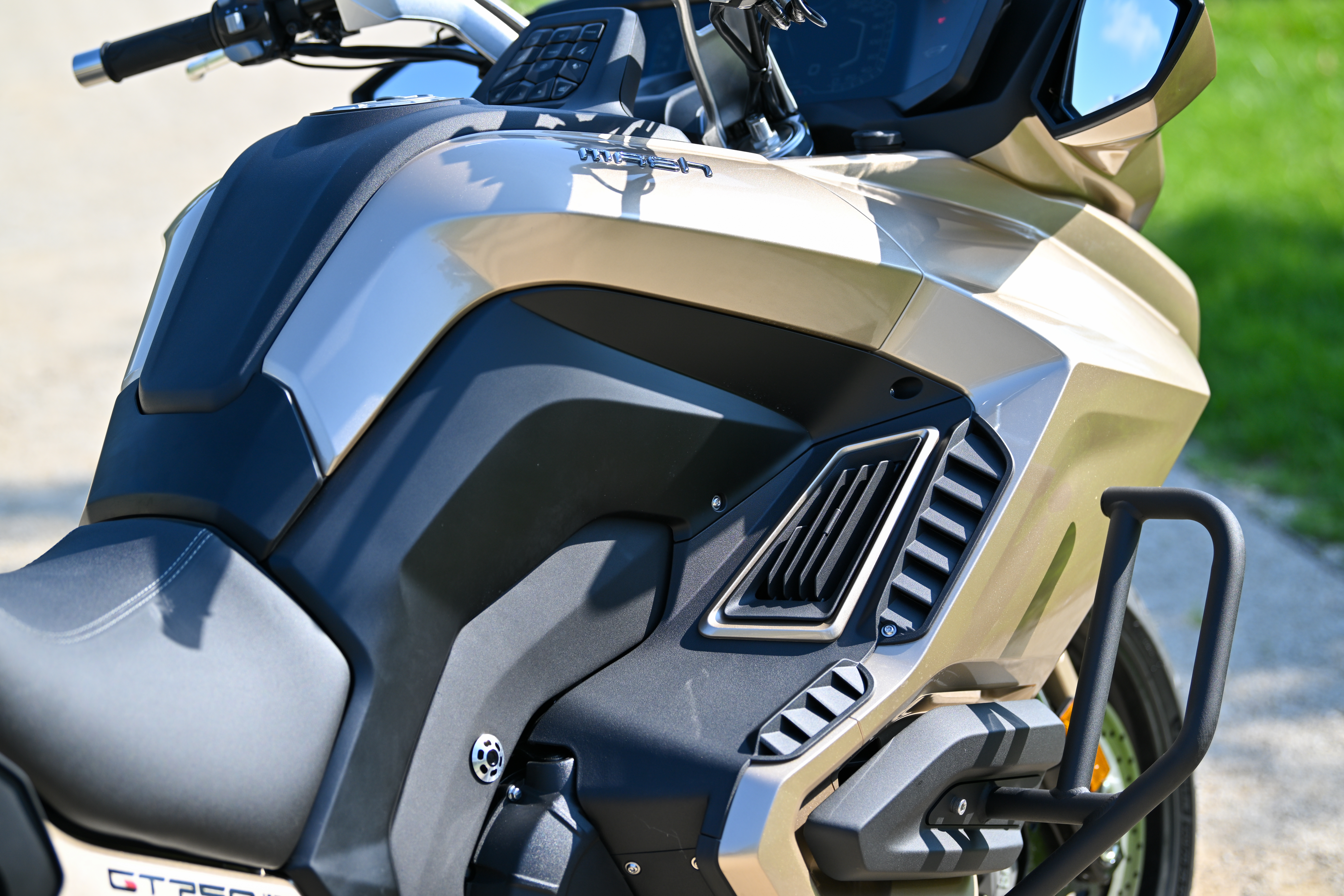 En attendant, elle a de la gueule, cette moto. Et de beaux volumes. Surtout dans son coloris champagne mettant en valeur son habillage intégral. Elle se montre effectivement très flatteuse visuellement, avec ses optiques à LED, ses deux amples valises à ouverture électrique (depuis la commande centrale) aptes à contenir un casque intégral de taille moyenne, ses pare-flancs discutables niveau look, mais rassurants, son porte-paquet et ses volumes généraux semblant particulièrement protecteurs. Notez au passage les petites grilles du tablier intérieur dont celles orientables vers le haut du corps permettant d’exploiter la chaleur du moteur. Certes, l’habillage est très plastique, notamment au nouveau de la console centrale façon Honda Goldwing ou ex RT et la qualité perçue n’est pas optimale, mais l’ensemble demeure plaisant et plutôt bien ajusté. On profite également de rétroviseurs légèrement rabattables aux miroirs montés sur rotule et aux clignotants LED intégrés.