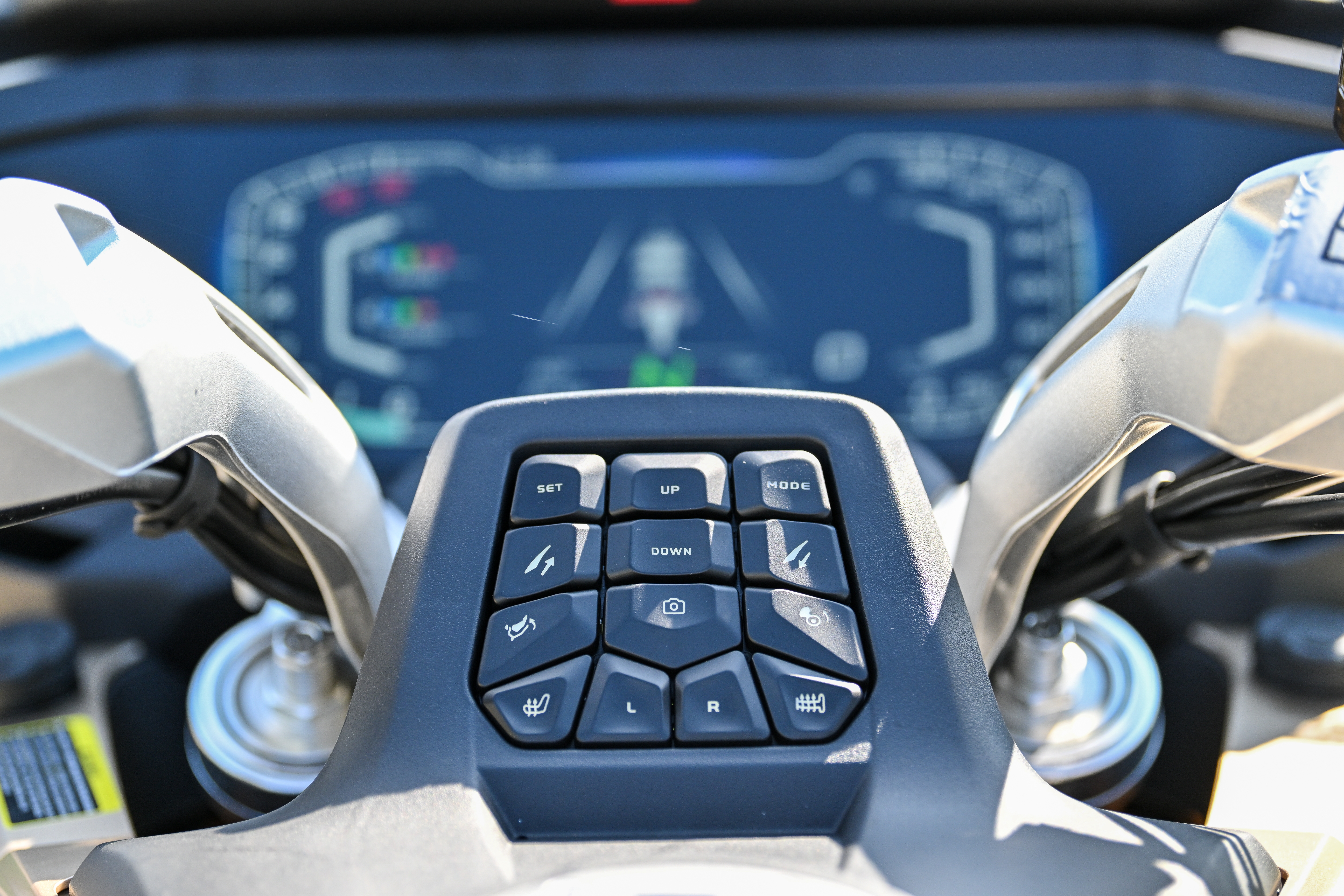 La présentation de l’instrumentation est colorée, voire coloriée, mais suffisamment « sobre » au niveau du fond, à défaut d’être réellement dans les standards esthétiques du jour. Du moins les nôtres. Le pseudo-effet 3D central peut laisser place à un autre affichage (ouf), c’est toujours cela de pris. Sauf que l’on visualise alors… une moto. Pas foufou. On se console avec le démarrage sans clé à la fois simple et efficace. À ce sujet, la bulle électrique se commande une fois encore depuis le petit îlot central dont la rigidité est insuffisante au niveau de sa base. Elle est complétée par de petits déflecteurs au niveau de la jonction avec la tête de fourche. Au moins les boutons sont-ils assez réactifs et leur toucher précis. On ne rechigne donc pas à les utiliser pour manipuler la bulle ou encore pour naviguer dans le menu. À ce jour, la capture d’images par la dashcam n’est pas officiellement exploitable, tandis que le dispositif est fonctionnel, mais non activé.