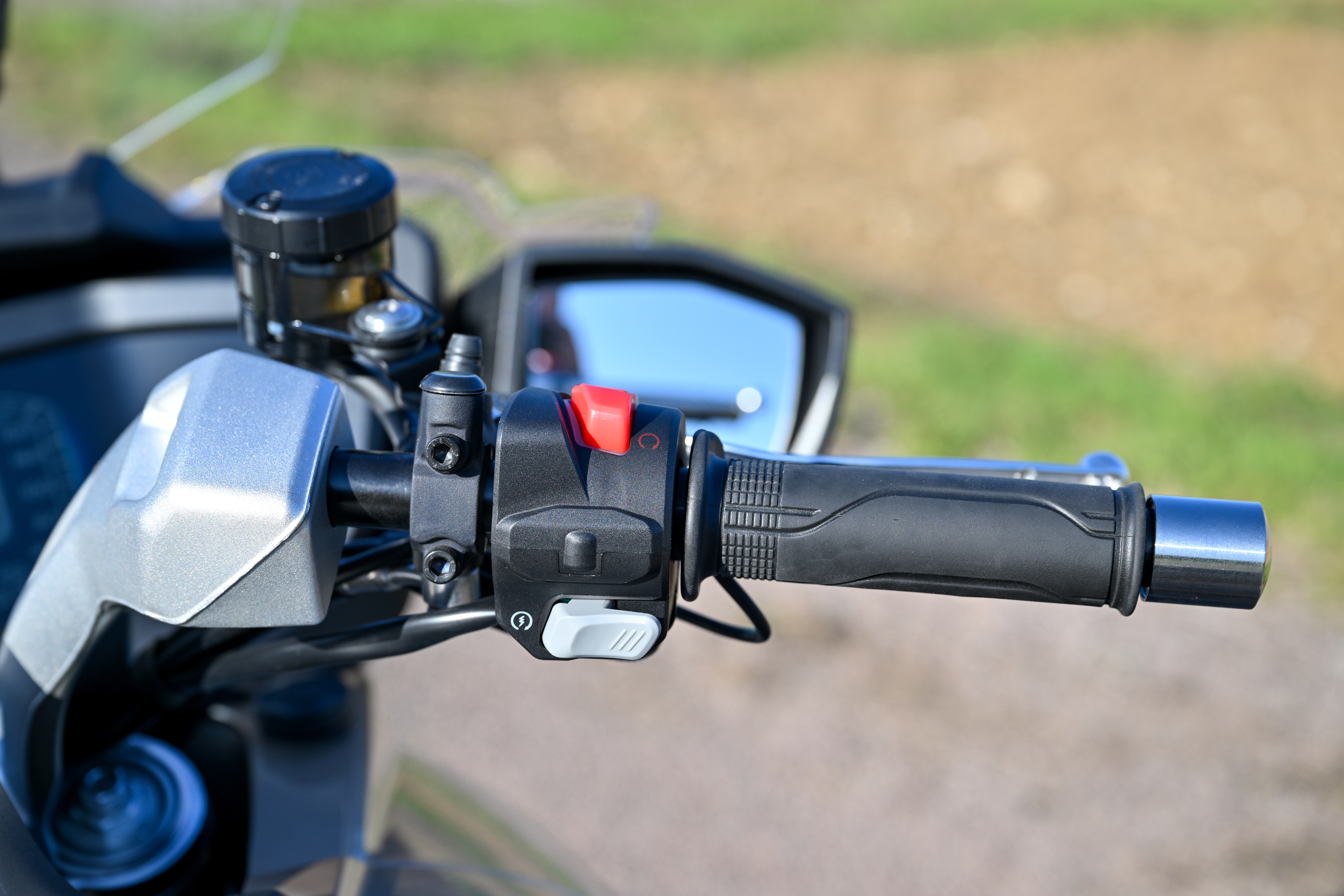 Le poste de conduite est assez agréable et l’ambiance à bord léchée-dans la mesure du possible et du budget-. Il est même possible de profiter d’une selle conducteur et de poignées chauffantes. De fait, les demi-guidons relevés sont une belle pièce dégageant la vue sur un écran TFT de 12,3 pouces suffisamment réussi pour plaire aux yeux et convenir à sa fonction première tout en proposant davantage grâce à une connexion avec un smartphone. Dès lors, il est possible de profiter d’une navigation GPS par exemple (via l’application gratuite la première année Carbit Ride), en sus de l’info divertissement. Par contre, aucune radio n’est prévue sur ce modèle, malgré la place disponible à cet effet. Le kit mains libres dans le casque a de beaux jours devant lui.