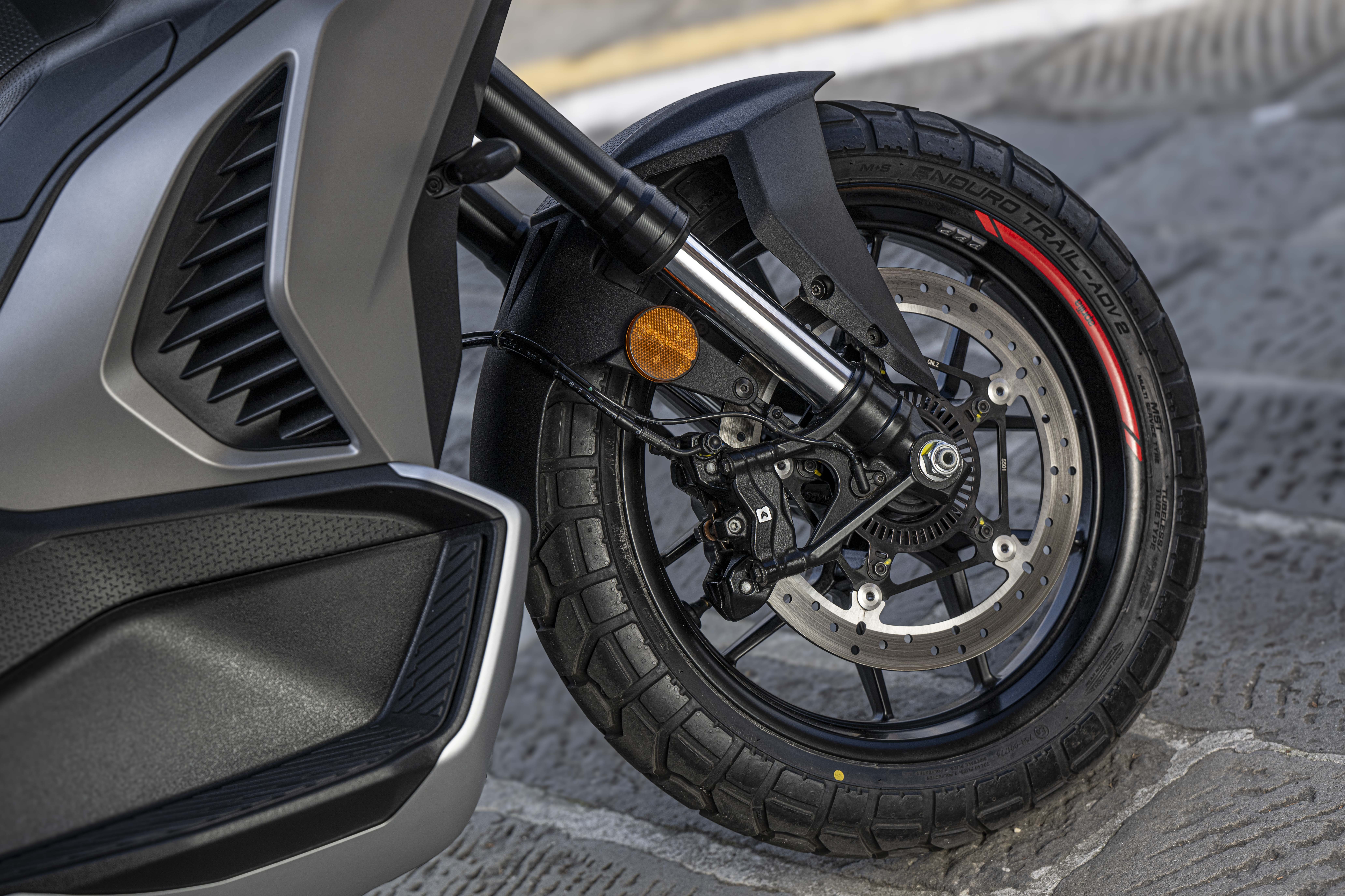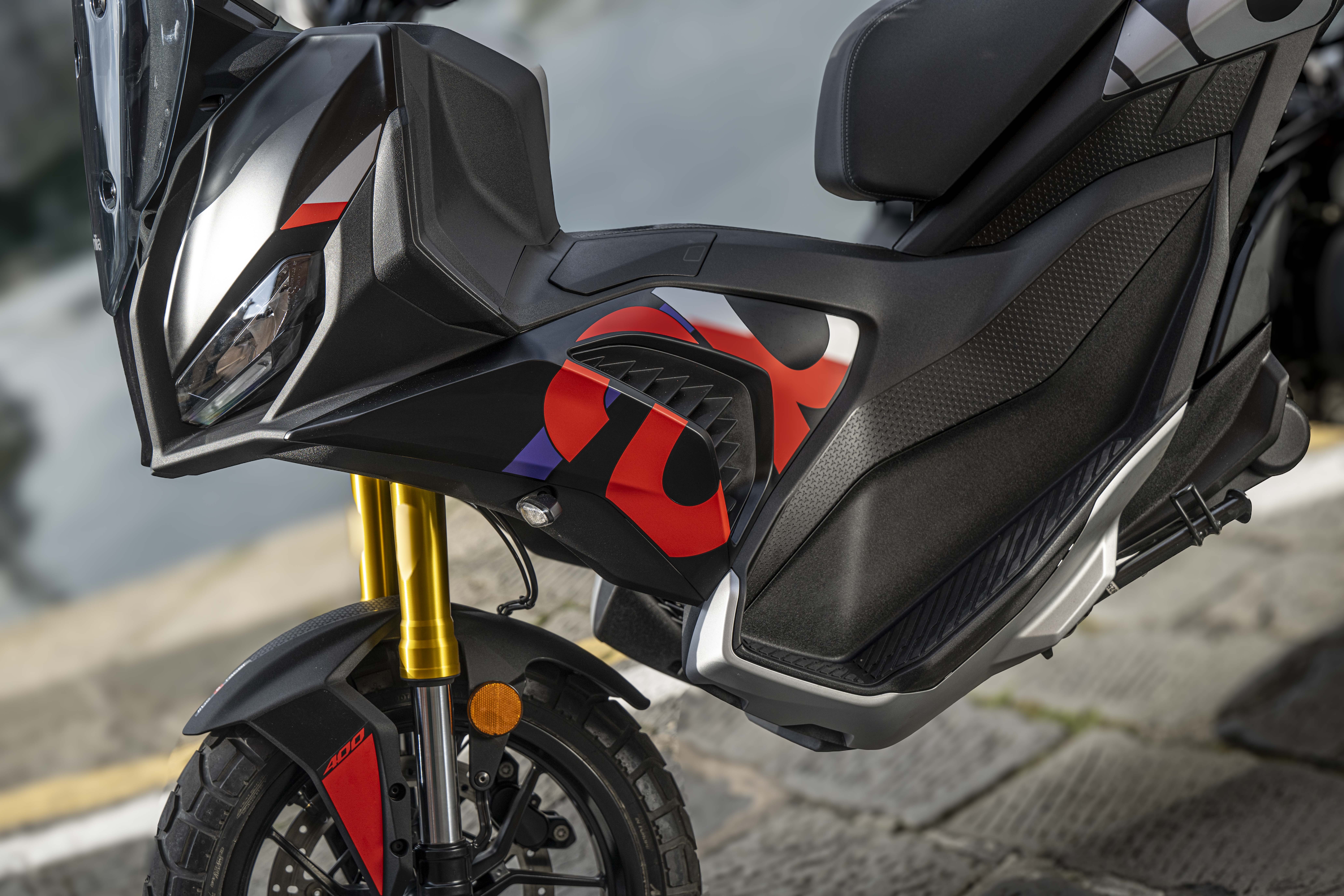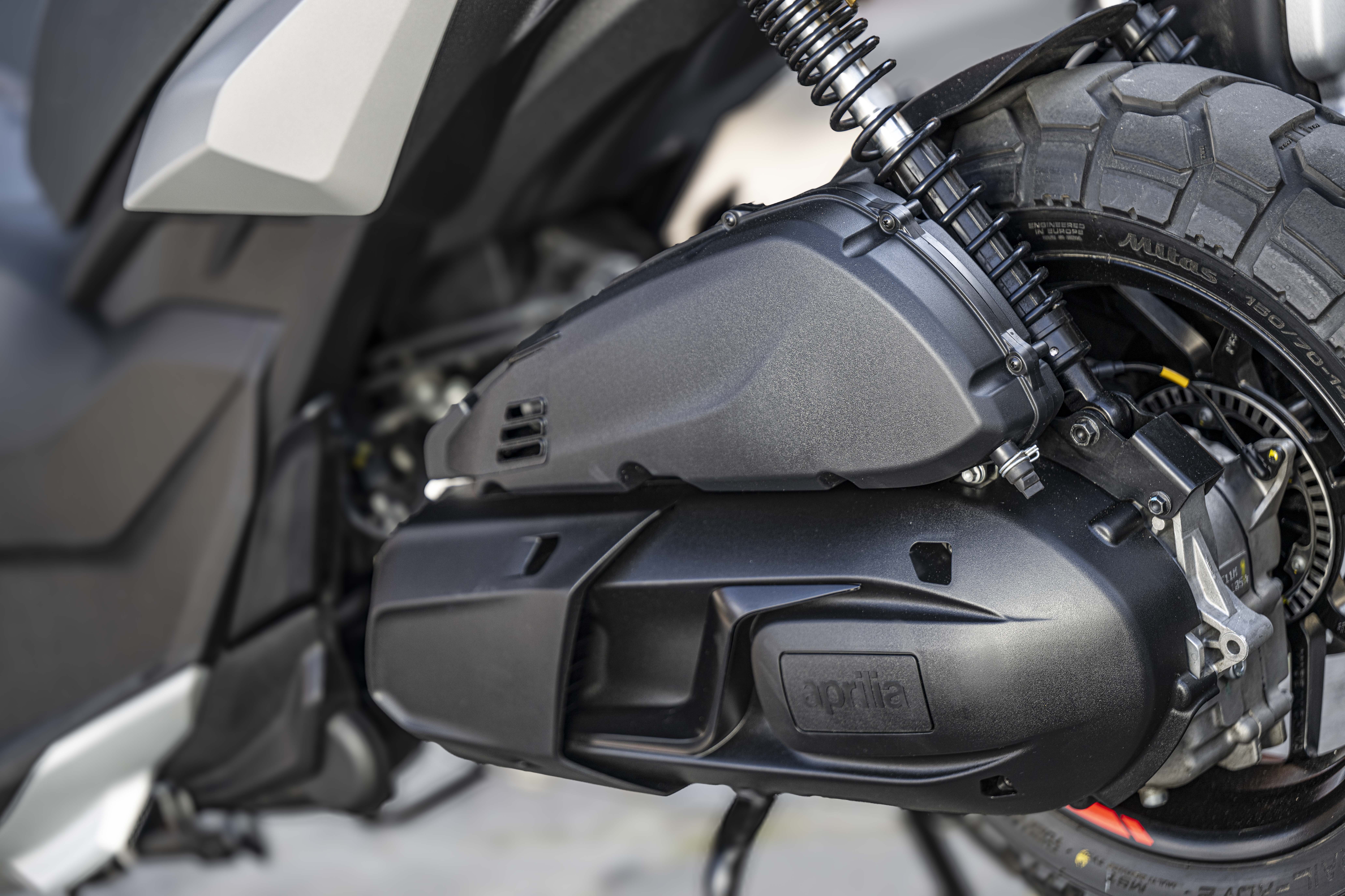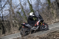 Moteur et châssis sont aussi d’origine Aprilia. Un cadre tubulaire acier type à double berceaux soutient le monocylindre Piaggio HPE 400 de 399 cm3 (84x72 mm) dont l’unique arbre à cames entraine 4 soupapes. Son rapport alésage-course devrait faire un bon compromis entre puissance dans les tours et effet de couple des relances à bas régimes. Le bloc en position centrale présente également une grande compacité. Il développe une puissance de 36 CV à 7 500 tr/mn et une force de 37,7 Nm à 5 700 révolutions/minute via une transmission CVT (Continuously Variable Transmission) logée dans le double bras oscillant. Cette boîte de vitesses automatique sans rapports fixes, utilise deux poulies coniques reliées par une courroie pour offrir une accélération fluide, constante et sans à-coups. Le contrôle de traction (ATC) est ajustable sur deux valeurs et désactivable. Histoire de dériver lors d’éventuelles sorties hors bitume. Pratique, la clef est système sans contact, gérant le blocage de direction, l’ouverture de selle, de bouchon d’essence et démarrage. Enfin, les révisions sont espacées de 10 000 km.