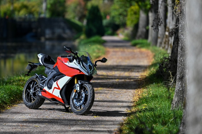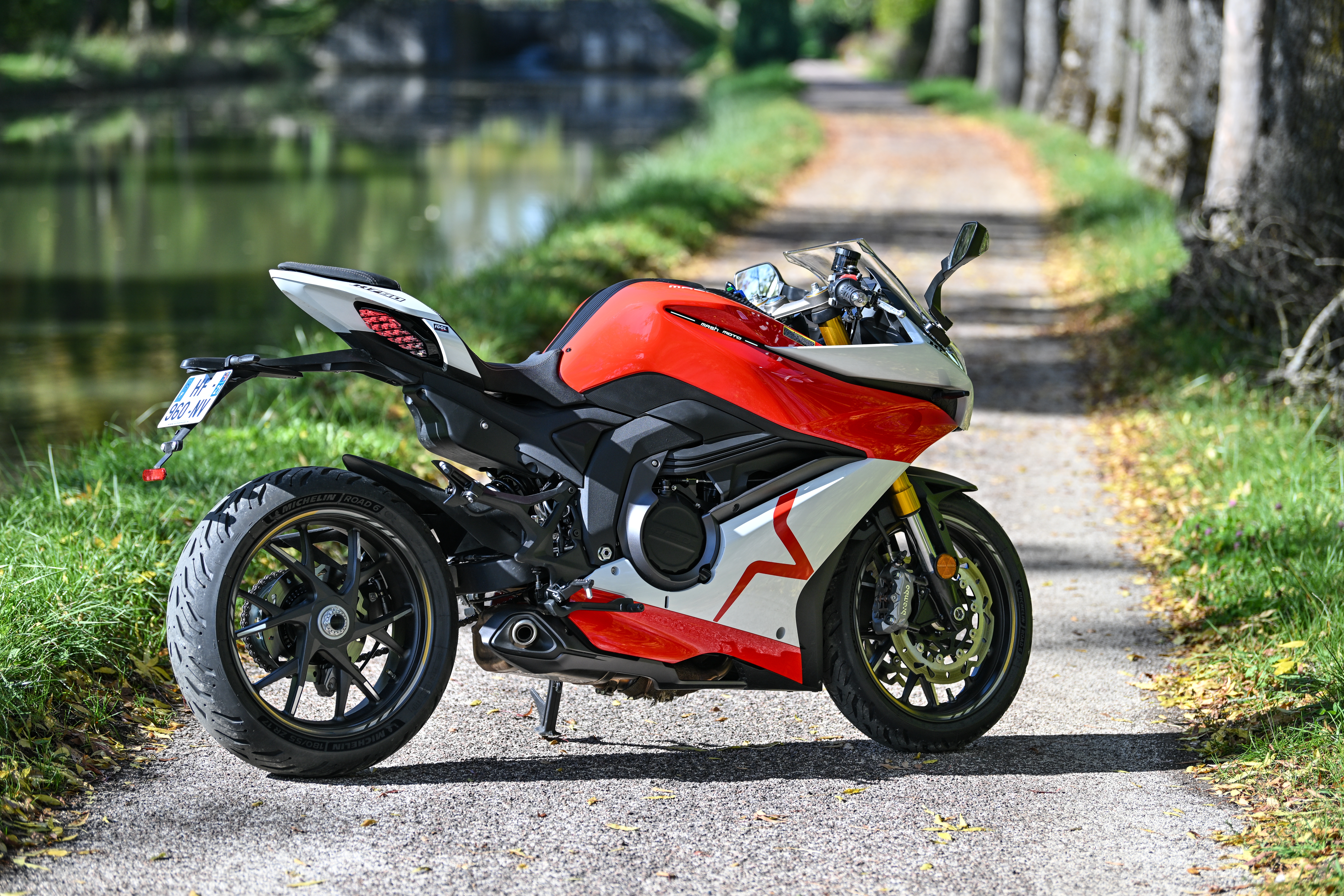 Les mains se retrouvent étrangement bas placées sur les commandes pour une moto « de route » avec ce type de pneu (Michelin Road 6) du meilleur effet niveau visuel et de motorisation, tandis que le corps est audacieusement basculé sur l’avant. La colonne de direction s’ouvrant à 25° semble privilégier la stabilité du train directeur, ce que n’aurait pas forcément nécessité le pneu arrière de 180, important pour une catégorie et une cylindrée davantage habituées à mouvoir un peu de 160, plus cohérent mais bien moins valorisant : impossible de deviner ce qui se cache sous le carénage d’une telle moto tant qu’on ne l’a pas entendue tourner. Quant à l’empattement, il affiche une valeur courte, avec seulement 1 464 mm. On s’en doutait rien qu’en regardant l’emplacement de la selle passager, au-dessus de la roue, mais avancée par rapport à l’axe de roue. Qu’à cela ne tienne !