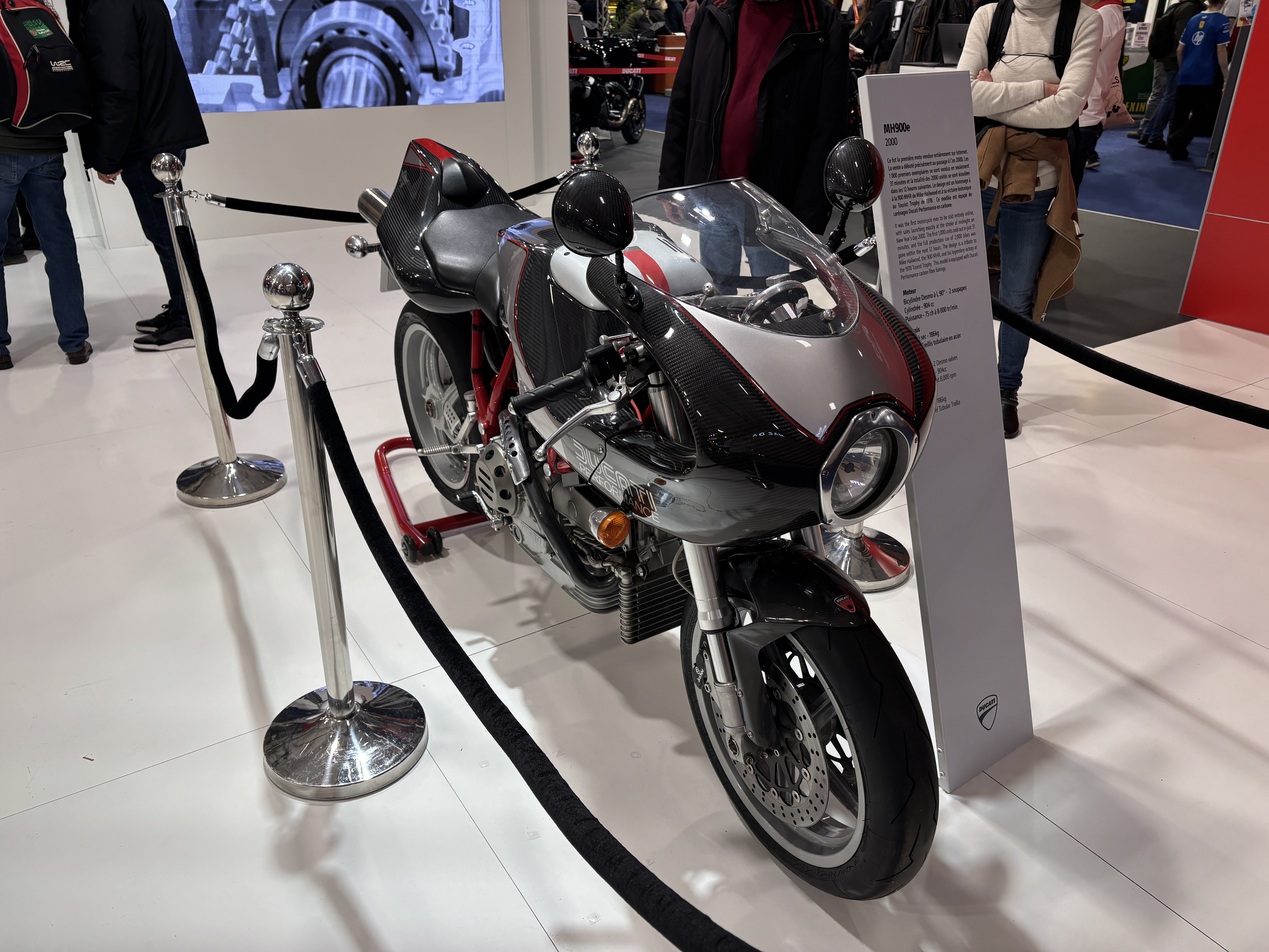 Deux modèles extrêmement rares ont également fait le déplacement à la porte de Versailles. D'un côté, la SportClassic 1000 Paul Smart, un hommage au premier bicylindre de la marque, la 750 SS avec laquelle Paul Smart avait remporté les 200 miles d'Imola en 1973. Le modèle exclusif dispose d'un sacré pedigree, car il s'agit du châssis n°1 avec 0 km au compteur et il a été dédicacé par Paul Smart en personne. Il est à vendre à un prix d'environ 50 000 €. À ne pas manquer également cette MH900e, qui fut la première moto vendue entièrement sur internet. La vente a débuté lors du passage à l'an 2000. Les 1 000 premiers exemplaires ont trouvé acquéreurs en 31 minutes et la totalité des 2 000 exemplaires les 12 heures suivantes.