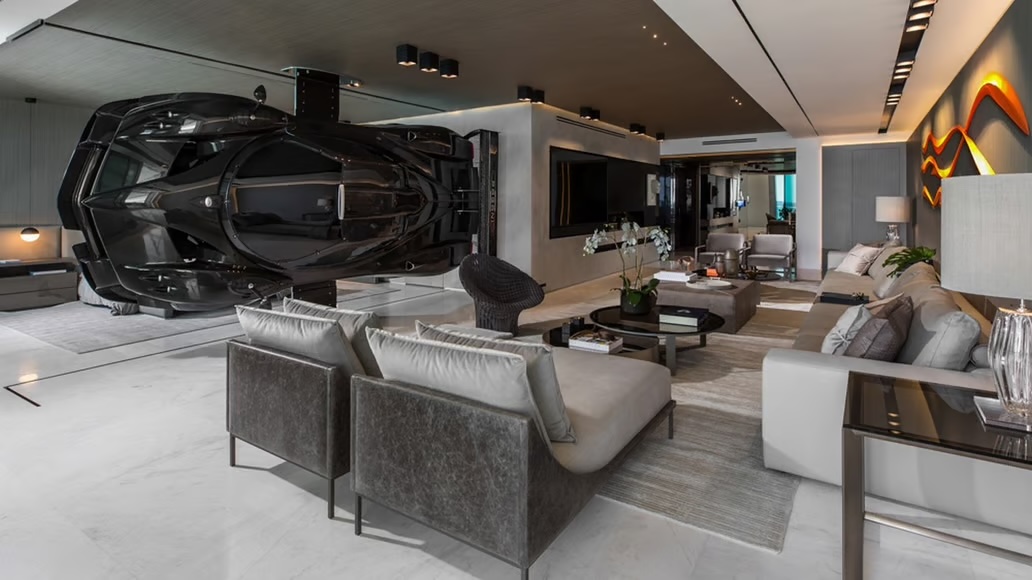 Dans le monde du bâtiment, les pièces sont habituellement séparées par des plaques de plâtre. Le propriétaire de cet appartement voit les choses différemment en employant une Pagani Zonda R.