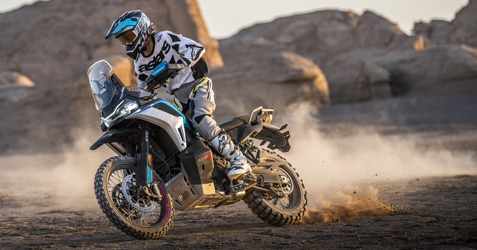 Affichant 222 kg sur la balance, dotée d’un réservoir de 22,5 litres, de roues avec jantes à rayons de 21 pouces à l’avant et 18 pouces à l’arrière, la CFMoto 1000MT-X est chaussée de pneus Pirelli STR.