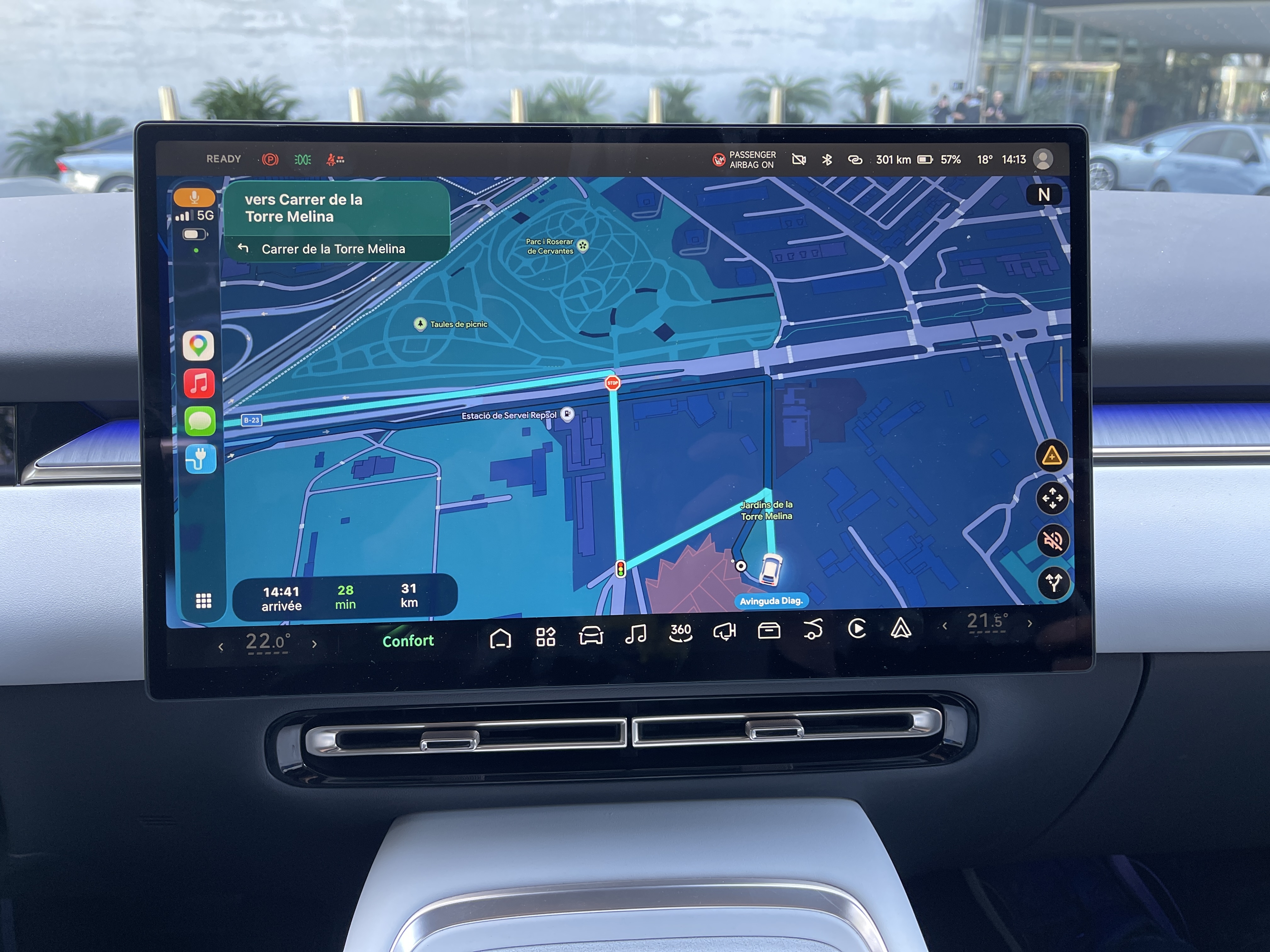 C’est sous un soleil barcelonais, vif, mais pas excessivement chaud (18°C) que nous découvrons la grande berline chinoise. Son look mêlant diverses influences n’est pas déplaisant, mais il manque quelque peu de personnalité à l’avant, l’arrière se volant plus original. L’ensemble évite la surcharge visuelle, ce qui reste bon à prendre à l’heure actuelle ! L’intérieur s’inspire délibérément de Tesla, un grand écran tactile dominant une planche de bord épurée. Comme chez l’Américain, les boutons de commandes brillent par leur absence (sauf ceux des vitres électriques), tout se concentrant dans l’écran, y compris l’ouverture de la boîte à gant. Dommage, car l’afficheur central manque de réactivité et comporte des menus pas toujours clairs. En revanche, on peut en personnaliser la barre des tâches, comme sur un ordinateur, en y glissant les raccourcis que l’on préfère. D’un glissement sensuel et vertical du doigt, on fait défiler les affichages : c’est amusant à l’arrêt, mais franchement déconseillé en roulant !
