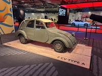 La 2 CV ou projet TPV (Toute Petite Voiture) a été lancée en 1936. Le cahier des charges était strict : transporter quatre personnes et 50 kg de bagages à 50 km/h. Sur les 250 exemplaires produits pour le Salon de Paris 1939 (annulé pour cause de guerre), presque tous furent détruits. Seuls quatre ont survécu : un retrouvé en 1968 et trois autres découverts en 1997 dans un grenier du centre d’essais de La Ferté Vidame. Aujourd’hui, sa philosophie de modularité — comme la banquette extractible — se retrouve dans les concepts électriques les plus récents. Un seul phare, à gauche : le code de la route n’en impose pas encore deux et pas de clignotants. On tend le bras, raison pour laquelle la moitié de la vitre est relevable.