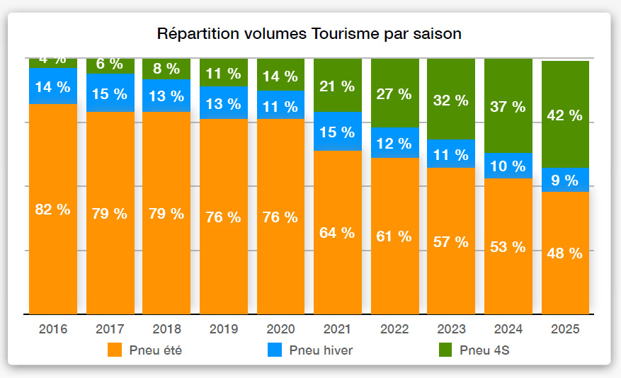 À partir de 2021, la mise en place de la loi montagne va mettre un sérieux coup d’accélérateur à son développement. Leur part de marché passe ainsi de 27 % en 2022 à 42 % l’année dernière. Pour sa part, le pneu hiver est devenu de plus en plus un produit de niche, passant de 15 % en 2021 à 9 % en 2025.