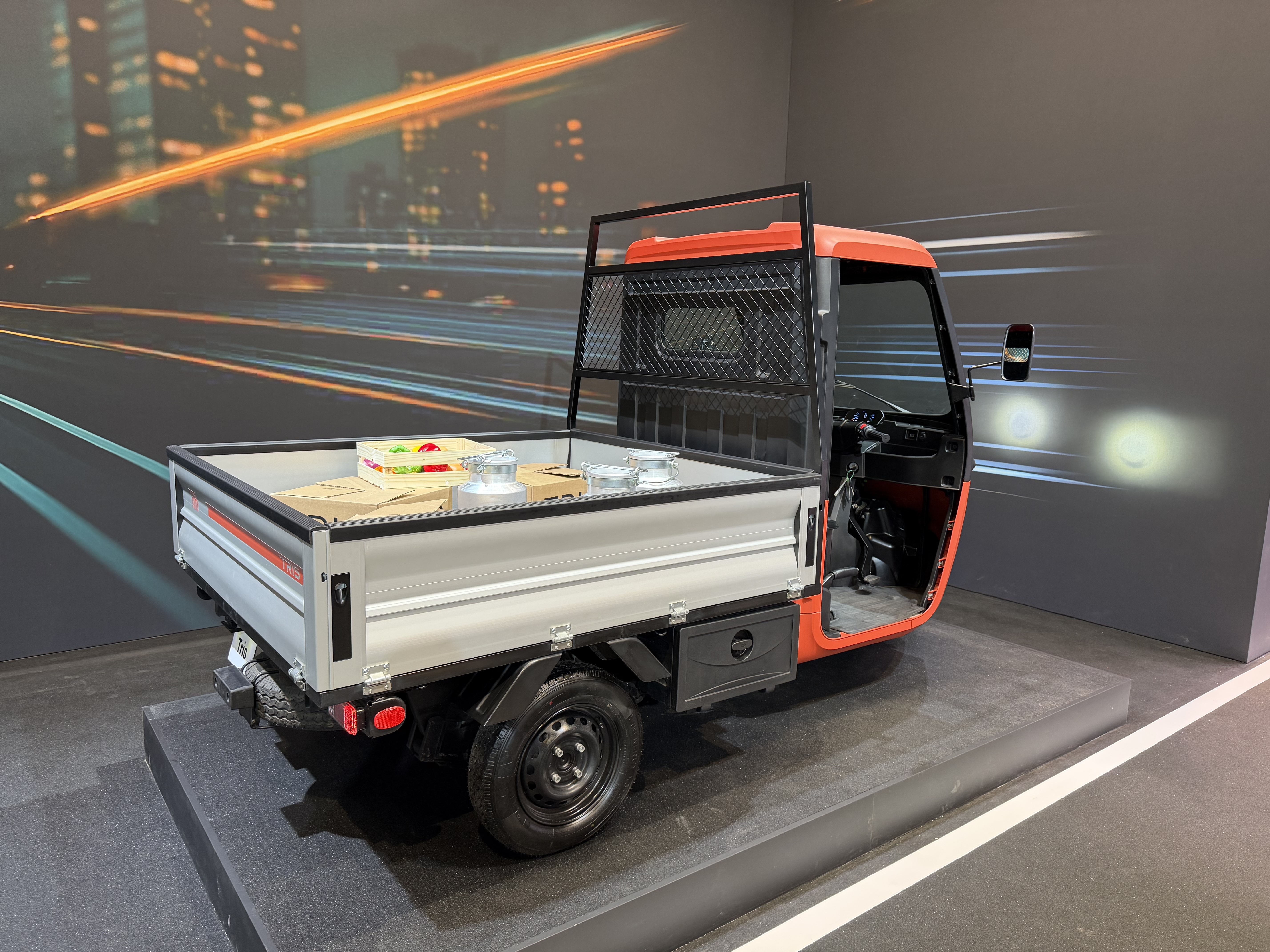 Côté charge utile, le Tris peut embarquer 540 kg. Il laissera le choix entre trois configurations avec un simple châssis-cabine, une version fourgonnette et la variante à benne visible au salon de Bruxelles 2026. Cette dernière permet d’embarquer une palette et offre 2,25 m2 de surface.