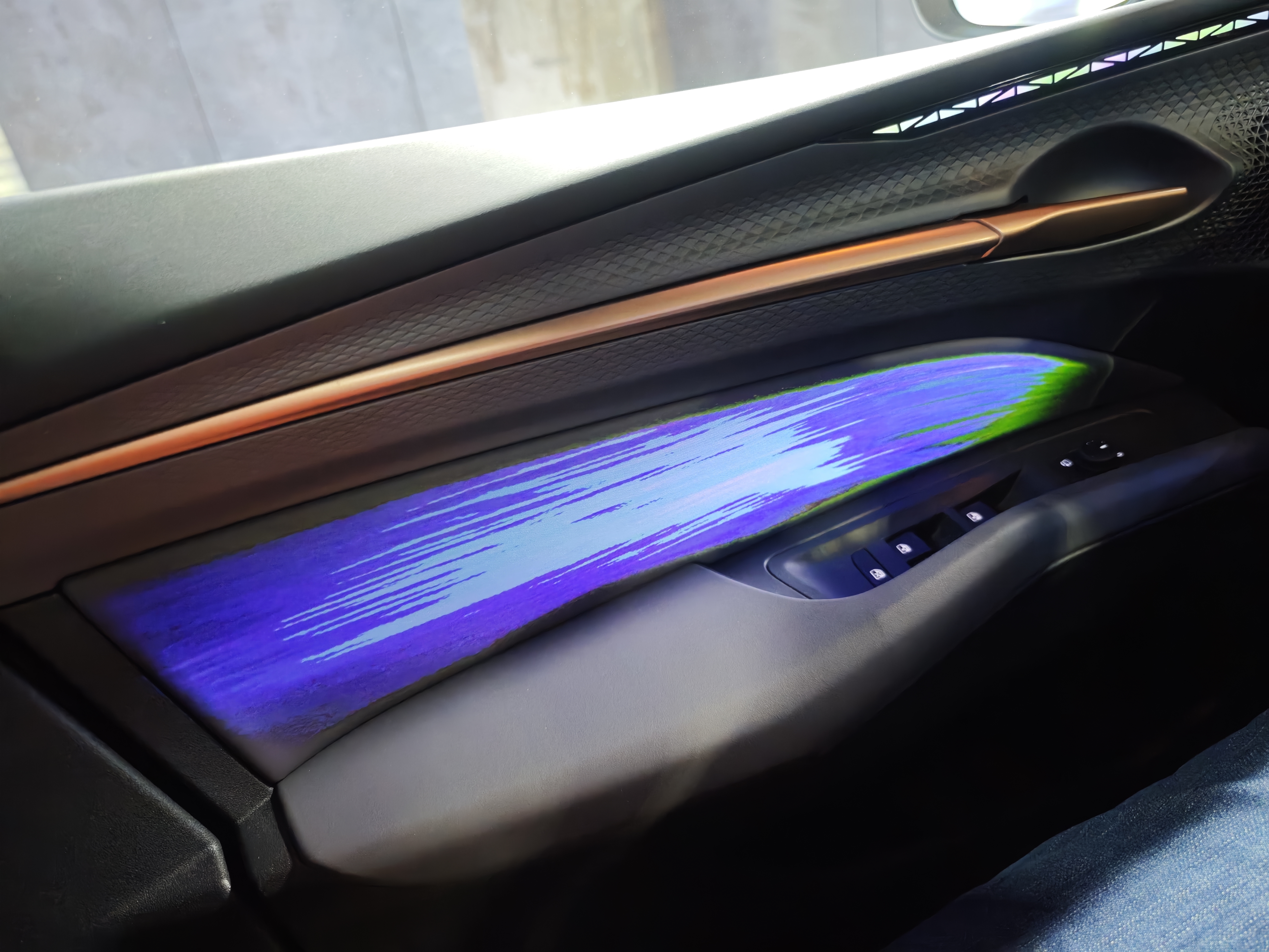 En effet, la Raval peut disposer de l’Ambient dash light, un système avec de petits projecteurs situés de chaque côté de la planche de bord, qui projettent sur les panneaux de porte des motifs lumineux colorés personnalisables, et animés, ce qui permet de se concocter une ambiance à la carte. Est-ce utile ? Absolument pas. Est-ce joli ? Oui plutôt. Ca rendra jaloux les voisins, ça c’est sûr. Mini s’y était essayé en projetant des motifs aussi, mais seulement sur la partie supérieure de la planche de bord. Ici c’est plus élaboré, et complètement inédit dans la catégorie, et même dans l’industrie automobile.
