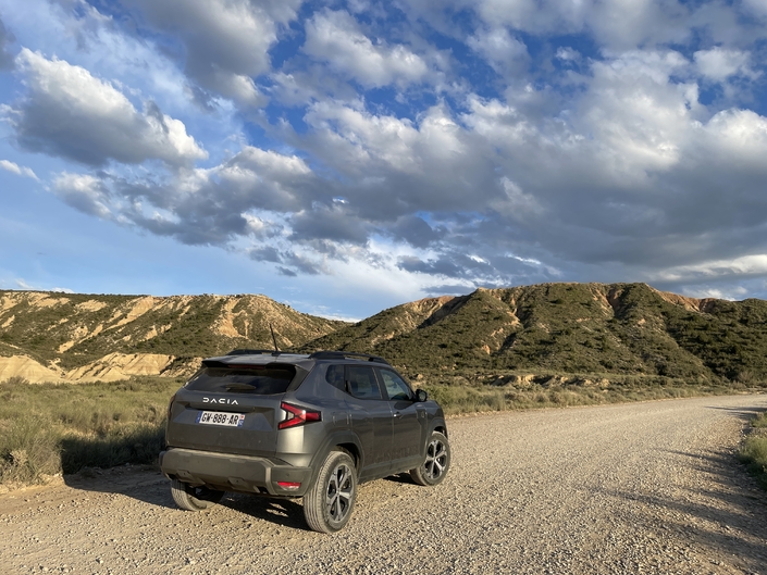 Nous reprenons la route après avoir réalisé quelques images. Il ne reste que peu de kilomètres avant notre destination, mais j’ai pour objectif de faire découvrir à Alain le désert des Bardenas où nous nous sommes rendus l’an dernier avec toute l’équipe de Caradisiac et une flopée de Seat et Cupra. Un petit détour qui vaut le coup, à réaliser via de petites routes secondaires planes, limitées à 90 km/h et quasi sans aucun carrefour, où notre Duster nous indiquera une sobriété remarquable de 4,6 l/100 km. Nous y rencontrerons la pluie, ce qui nous permettra de constater que les essuie-glaces automatiques, comme dans de nombreuses voitures, ne sont pas toujours réactifs.