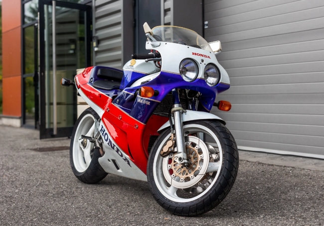 Pour finir, voici le graal pour les courses d’endurance « classic » : la sulfureuse Honda VFR 750 R, plus connue sous le nom de code « RC 30 ». Cet exemplaire est du millésime 1988. Les jantes d’origine seront fournies avec la machine. Immobilisée pendant plusieurs années, son nouveau propriétaire devra lui offrir une révision complète avant de pouvoir reprendre la route (ou la piste) en toute sérénité. Pour l’estimation proposée entre 32 000 et 40 000 euros, on est peut-être un peu gourmand compte tenu de la morosité du marché actuel…