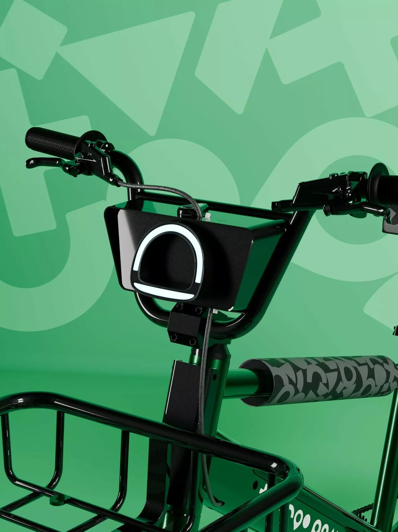 Le porte-bagage reçoit un support en mousse. Des repose-pieds façon BMX sont vissés au niveau du moyeu de la roue arrière. À l’avant, un panier capable de supporter jusqu’à 20 kg.