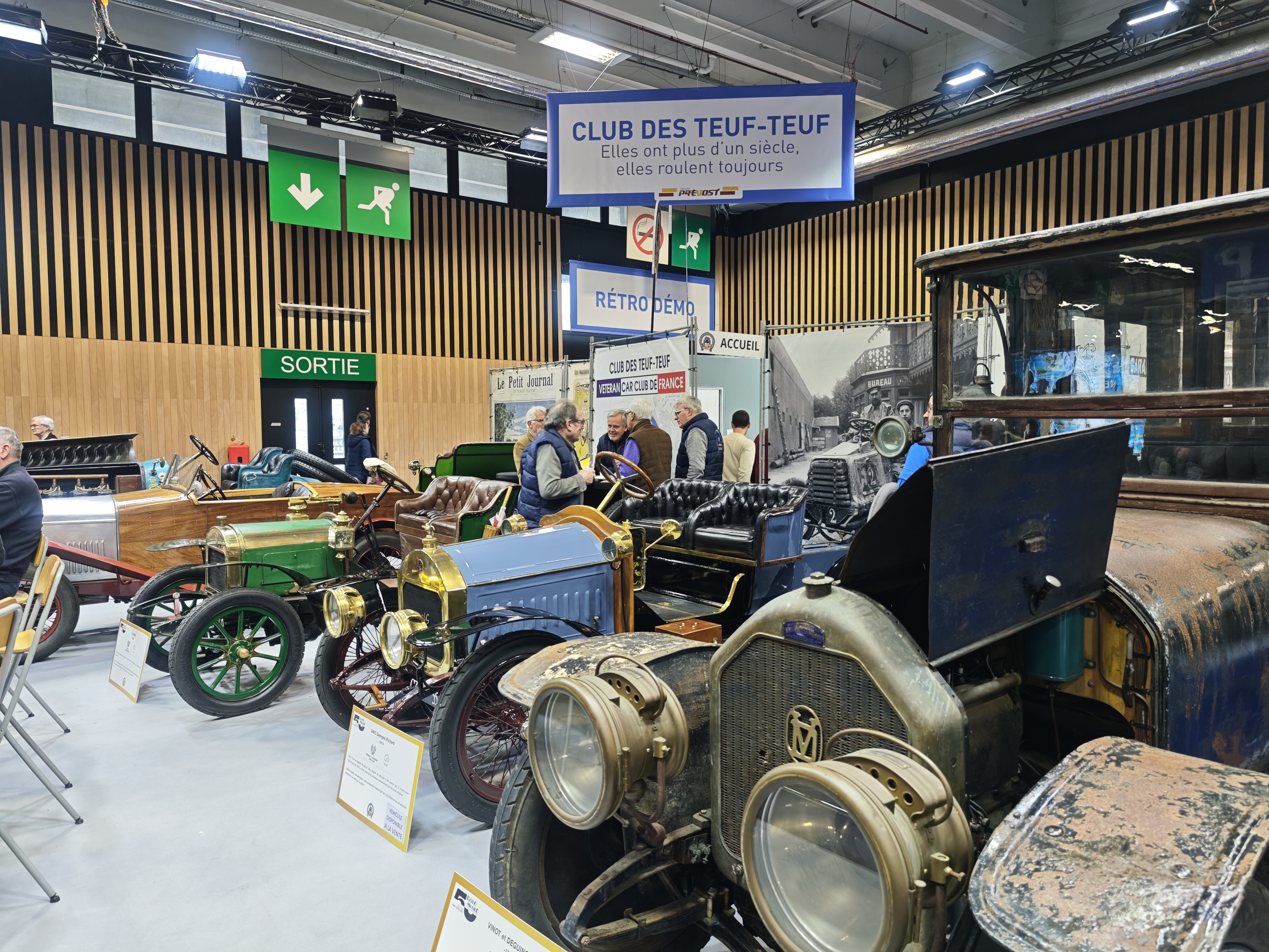 Les joyeux responsables et adhérents du "Club des Teuf-Teuf". Sur leur stand, ils s'affairent à renseigner les visiteurs sur les différents modèles présents, et deux fois par jours, font le bonheur des petits et des grands, en sortant leurs véhicules pour les faire rouler "pour de vrai". Impossible de les démarrer à l'intérieur bien sûr. Il faut les pousser jusqu'au parking extérieur du hall 7, avant de le démarrer à coups de manivelles, et de faire entendre les typiques pétarades des voitures anciennes.
