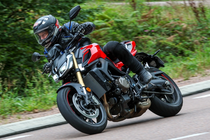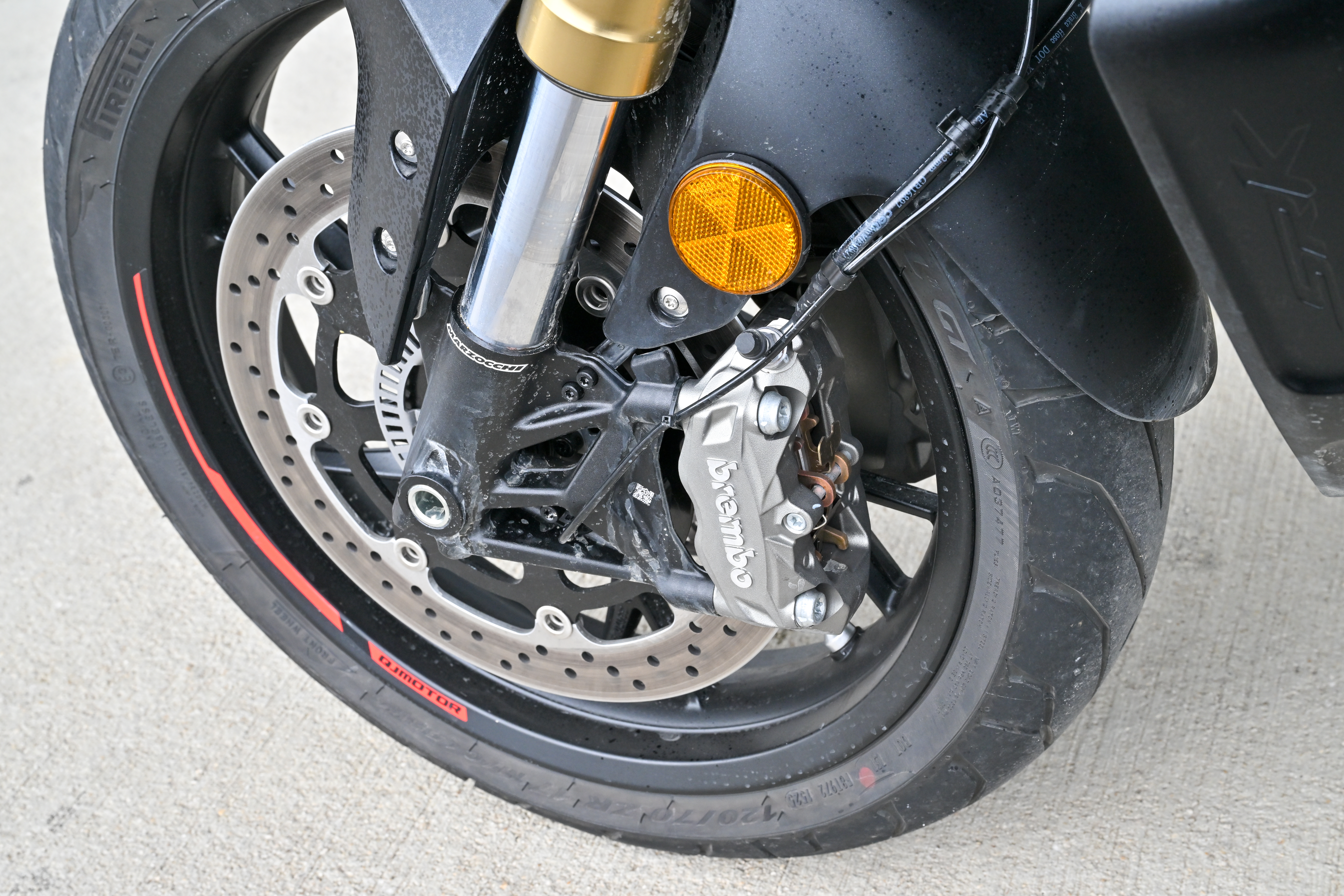 En pente, la selle conducteur se prête donc plus volontiers à la posture allongée sur le réservoir qu’à celle droit comme un « I ». Enfin, un « I » italique, le guidon quasiment plat se trouvant assez loin devant soi et tendant les bras en même temps que l’on courbe le dos. L’épaisseur de mousse est heureusement agréable, tout comme sa densité. Mieux encore : étroite à l’avant, elle permet de poser facilement les pieds au sol. Seuls l’habillage du réservoir de 17 litres et les carters moteur obligent à écarter un peu les cuisses. L’ambiance sportive est donc cultivée de toutes parts, avec des choix tranchés et assumés. Pour autant, un certain raffinement est présent dans les commandes rétro éclairées, tandis que les leviers sont réglables en écartement, notamment le maître-cylindre de frein Brembo, radial au même titre que les étriers qu’il pilote : des M4,32 devenus la norme chez nombre de fabricants.
