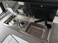 L’intérêt ? Il permet de dégager de la place tout au bout de l’engin, de manière à y installer la partie cuisine, car c’est justement en faisant la popote que l’on a besoin de se tenir debout, et de bénéficier de la partie la plus haute de plafond. Le résultat est spectaculaire et cet espace permet réellement de disposer d’un plan de travail digne de ce nom à côté de la plaque de cuisson et de l’évier.