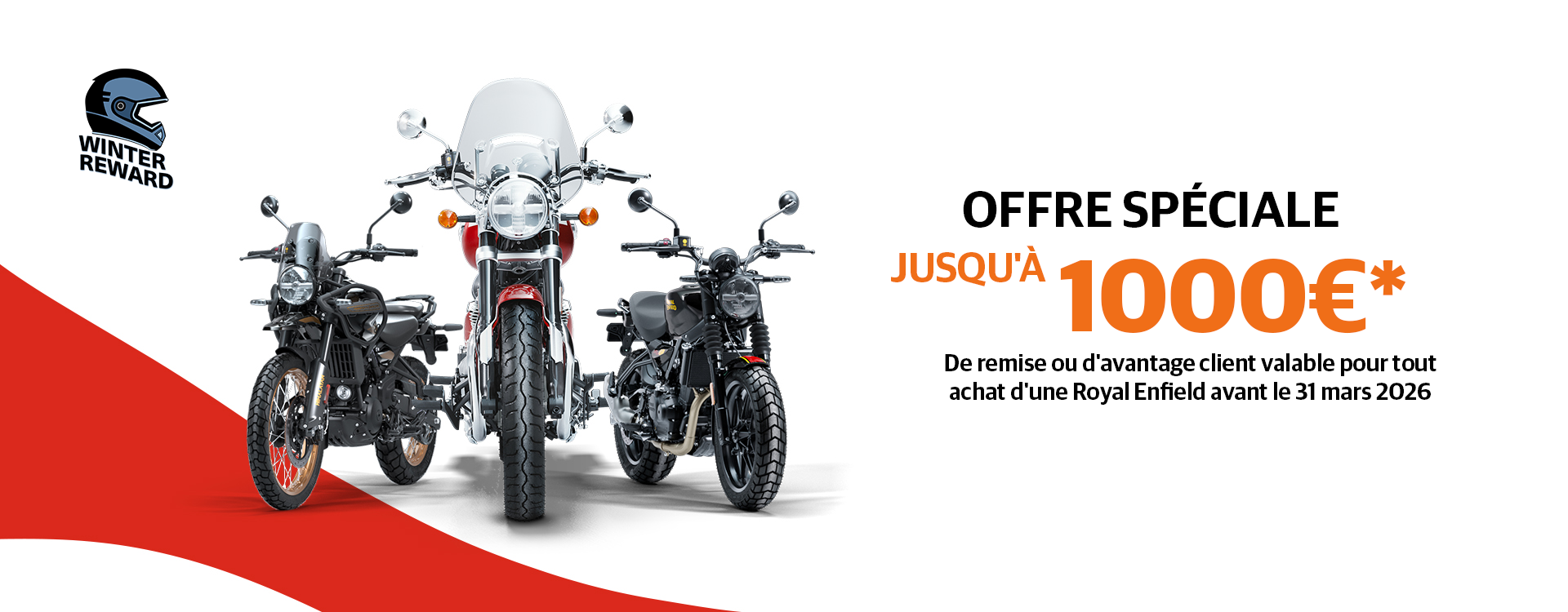 Jusqu’au 31 mars 2026, les clients peuvent profiter soit d’une remise immédiate sur la moto, soit d’un bon d’achat à valoir sur les accessoires et vêtements Royal Enfield.