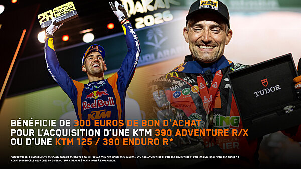 Pour marquer le coup après avoir conservé sa couronne dans le désert saoudien et remporté également la catégorie Malle Moto avec Benjamin Melot, KTM lance une offre spéciale sur une fenêtre de tir très courte puisqu’elle ne sera valable que ce vendredi 30 et ce samedi 31 janvier.
