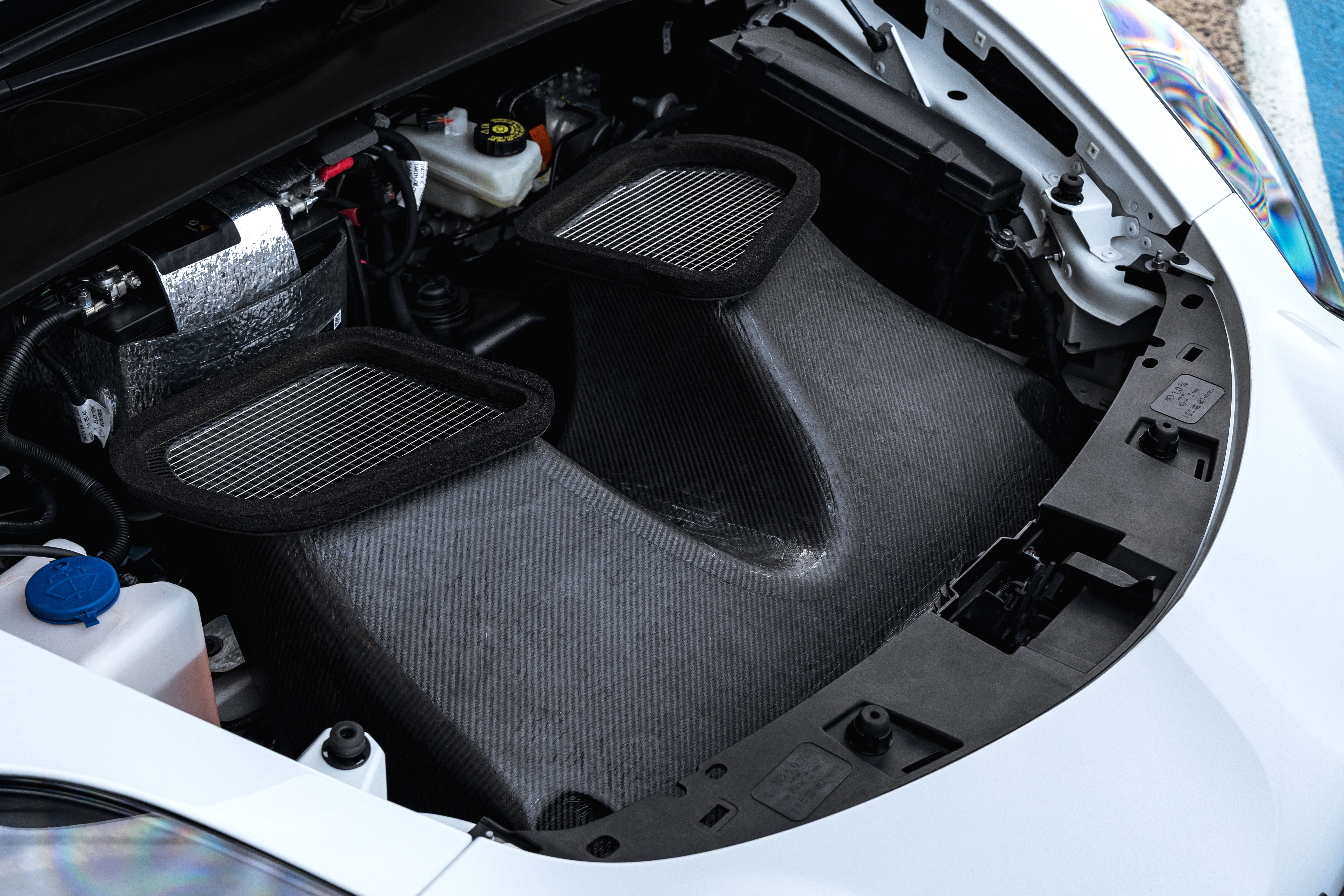 Hervé Mailliet, le responsable de projet de la R Ultime, s’en donne à cœur joie pour nous la détailler entièrement. Cela commence par les pneus Michelin Pilot Cup2 plus larges, spécialement développés pour elle, le marquage « A11 » sur les flancs le prouve. Plus résistants à la chaleur à l’intérieur de la bande de roulement, ils offrent un meilleur grip sur l’extérieur pour augmenter les vitesses de passage en courbe. Ces enveloppes chaussent de nouvelles jantes en aluminium forgées (18’’ à l’avant et 19’’ à l’arrière). Les jantes en carbone de la R, jugées trop fragiles et mises de côté par les clients, n’ont pas été retenues ici.