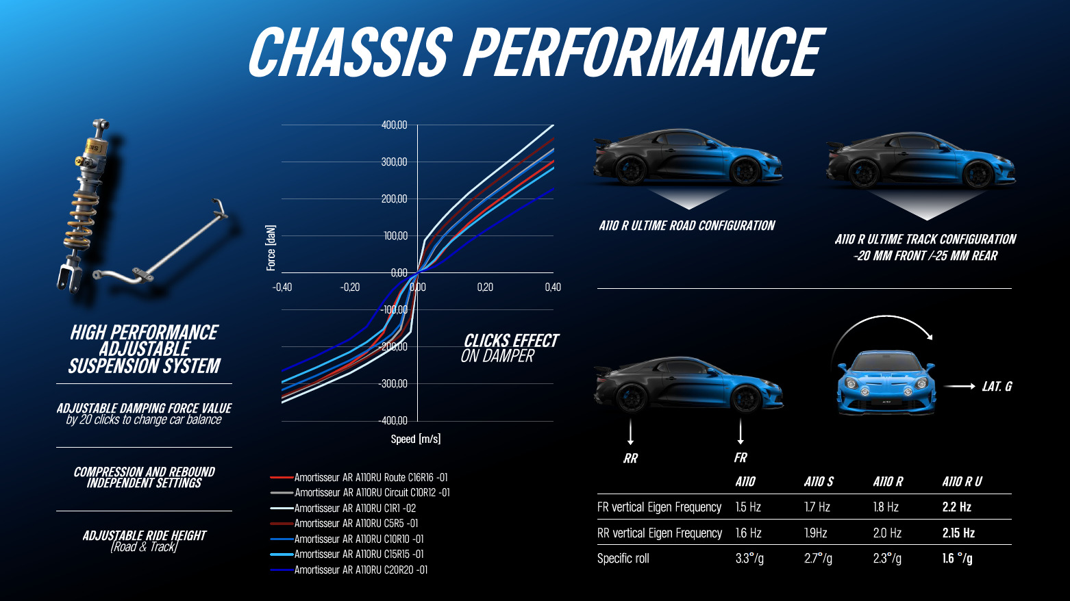 Issus de la compétition, plus exactement de l’A110 GT4, les amortisseurs Ohlins TTX sont réglables en compression et détente. La hauteur de caisse est également variable (-20 mm à l’avant et -25 mm à l’arrière contre -10 mm sur la R).