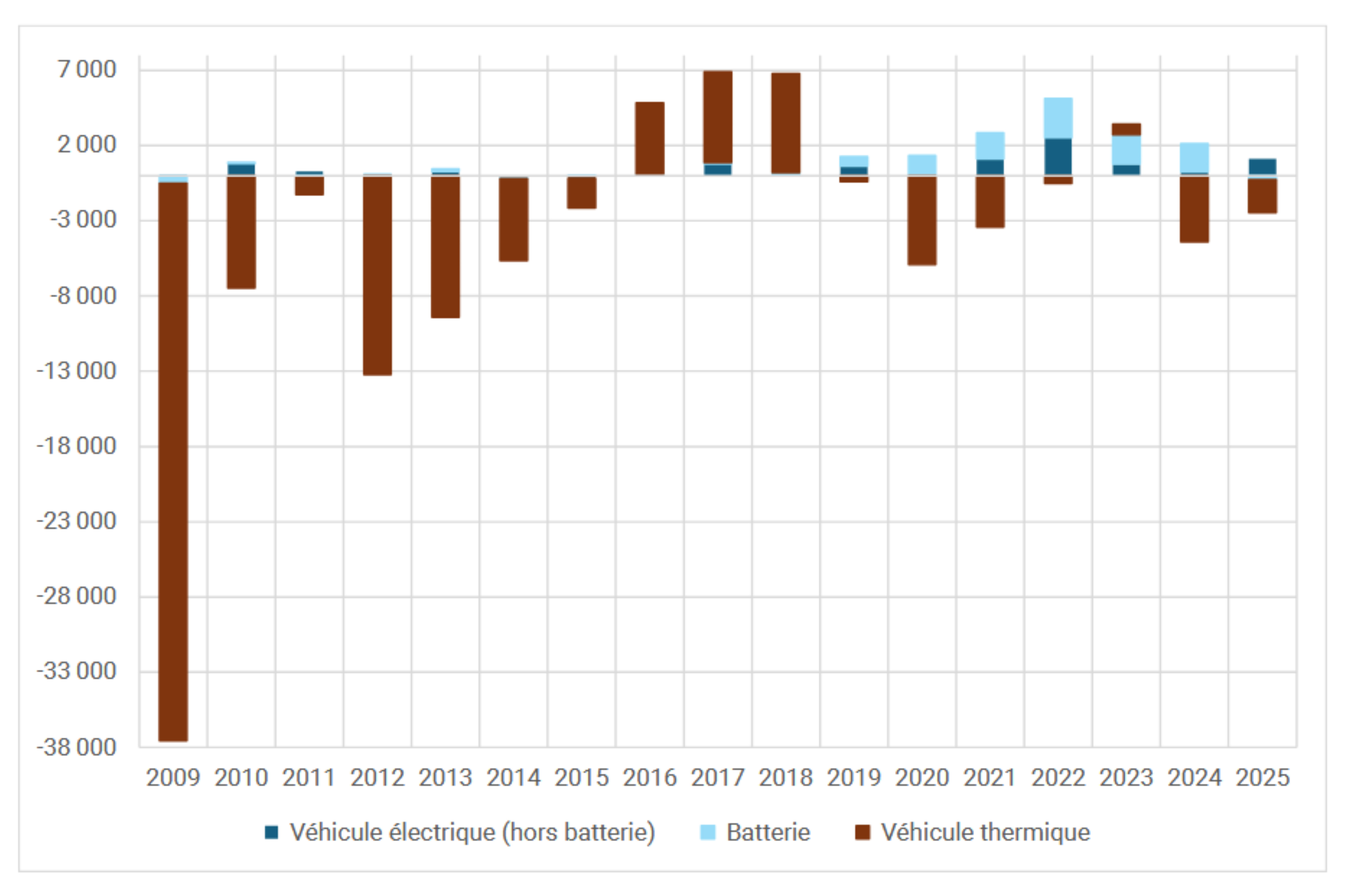 L’année 2025 marque un renversement de tendance inquiétant. Même la filière batterie, moteur de croissance ces quatre dernières années, bascule dans le rouge avec une prévision de -260 emplois. Ce coup d’arrêt s’explique par le report des investissements d’ACC et la restructuration de la start-up Verkor.