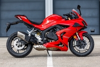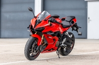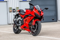 Les carénages sont agréables, là encore, et particulièrement réussis de forme. La moto est étroite et courte, avec un empattement de 1 450 mm, tandis que la selle n’est pas excessivement haute et placée à 810 mm, mais en pente vers l’avant, permettant de profiter pleinement d’un design fonctionnel. Notamment pour ce qui concerne la partie arrière, courte, racée et façon Panigale, ou encore le réservoir et son intégration dans les flancs offrant de poser aisément les pieds au sol. La qualité des plastiques est correcte, tout comme leur ajustement, sans que l’on ne parvienne au ressenti d’une R7 ou d’une Ninja 650 par exemple. Une histoire de référentiel, certes, mais surtout une supériorité des Japonaises en ce qui concerne les commandes à la main ou encore les poignées. Côté européen, on pense bien entendu à la Daytona 660, qui profite d’une puissance similaire et d’une belle prestance.
