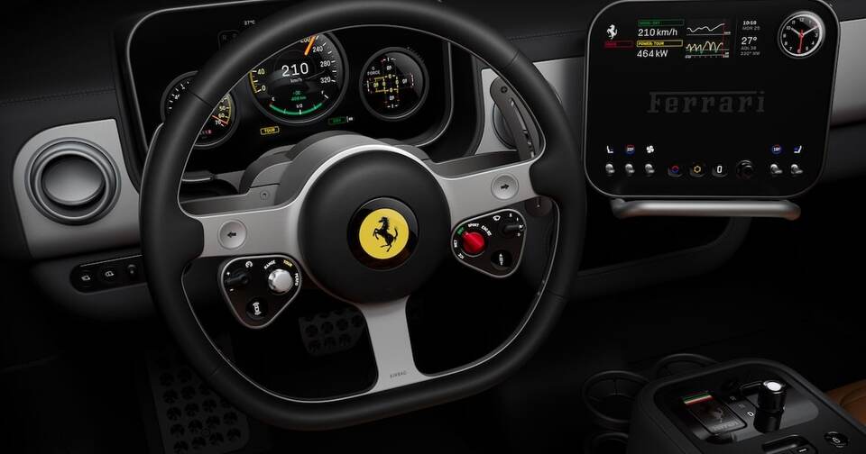 Rappelons que cette auto disposera d’un circuit électrique à 800 volts, d’une batterie énorme de 122 kWh de capacité, de quatre moteurs électriques développant plus de 1000 chevaux en puissance totale et avouera 2,3 tonnes sur la balance. Ferrari communique sur un 0 à 100 km/h abattu en 2,5 secondes et une vitesse maximale de 310 km/h. Rendez-vous dans quelques semaines pour en savoir plus et on vous laisse nous dire ce que vous pensez de ce drôle d’intérieur en commentaire.
