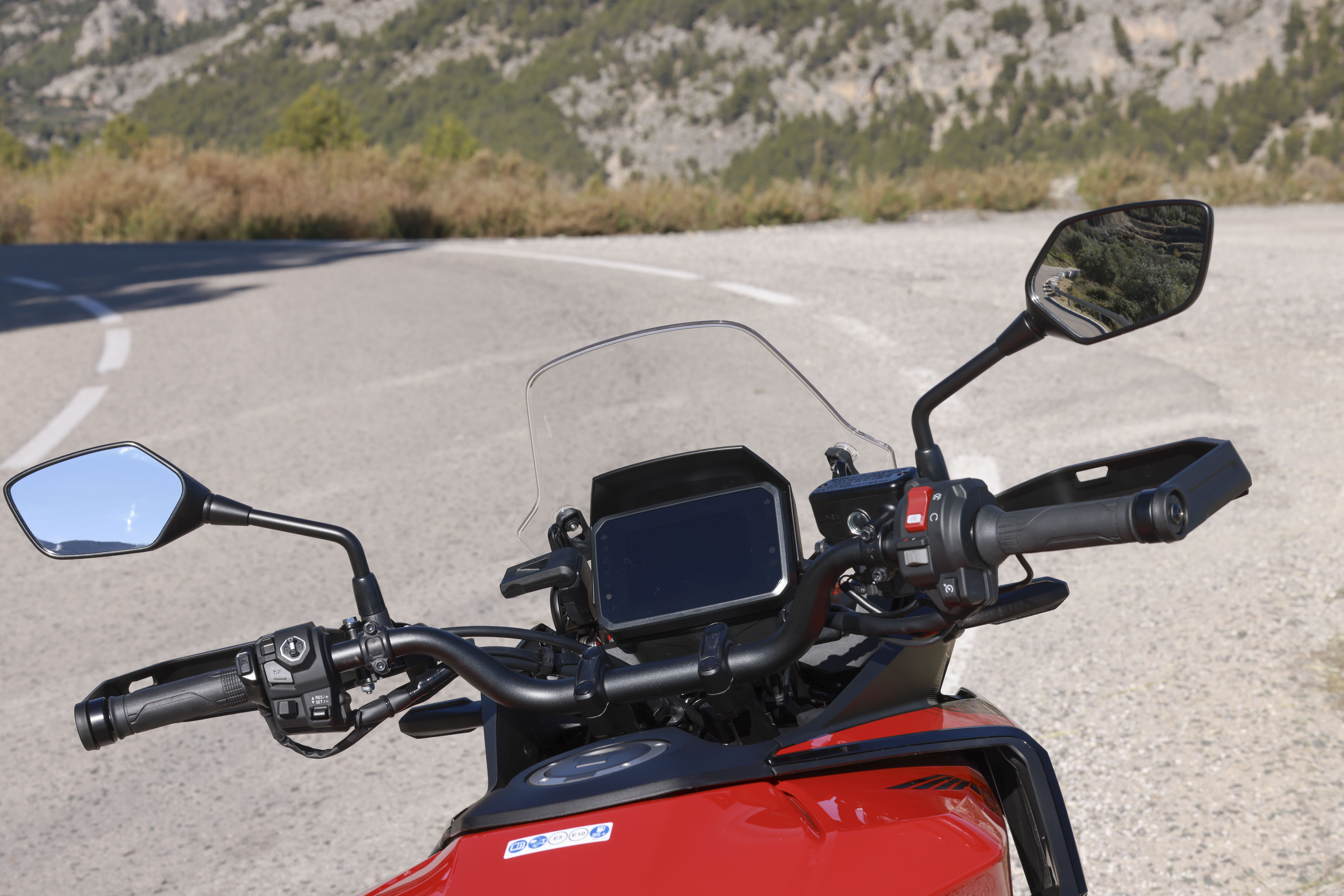 La bulle haute fait aussi partie de la dotation. Elle est plus large également dans sa partie supérieure. De petits déflecteurs haut et bas, parfaitement intégrés, augmentent le protection du buste. Par contre, les pare-mains d’origine sont plus symboliques que réellement protecteurs en cas de froid, mais le leviers sont bien protégés, c’est déjà ça. Les poignées chauffantes s’occuperont du reste. Font aussi partie du pack confort les feux longue portée, dont le commutateur se trouve à l’intérieur du cockpit côté gauche, à l’opposé de la prise USB-C. De quoi envisager l’autoroute en toute sérénité ? Nous n’allons pas tarder à le savoir.