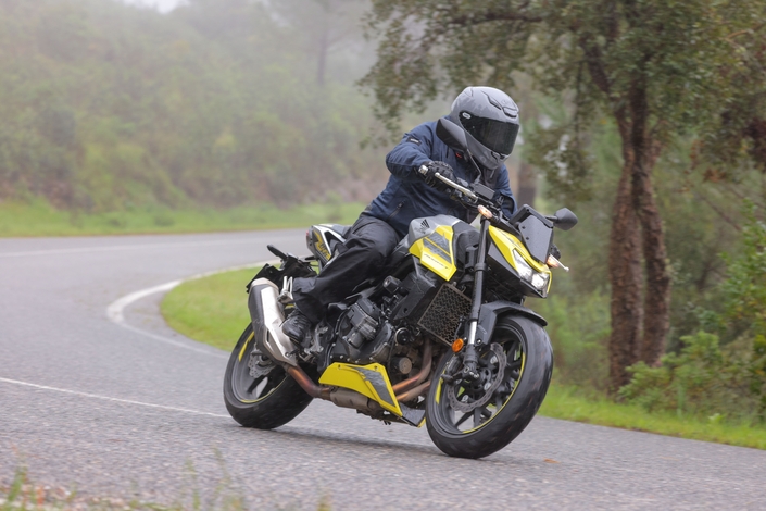 Côté freinage, la Hornet 750 est aussi bien proportionnée. À l’avant, les deux disques de 296 mm suffisent à stopper correctement la machine. Cette précision et cette efficacité sont aussi le résultat de l’action de la paire d'étriers 4 pistons de chez Nissin. Même si elle ne possède pas de durites tressées ou de maître-cylindre radial, on sent finalement que Honda n’a pas voulu faire de la course à l'armement, mais plutôt voulu se concentrer sur l’efficacité. La firme japonaise a donc effectué une bonne combinaison de composants. La sensation au levier est bonne et la pression sur celui-ci offre précision et dosabilité.