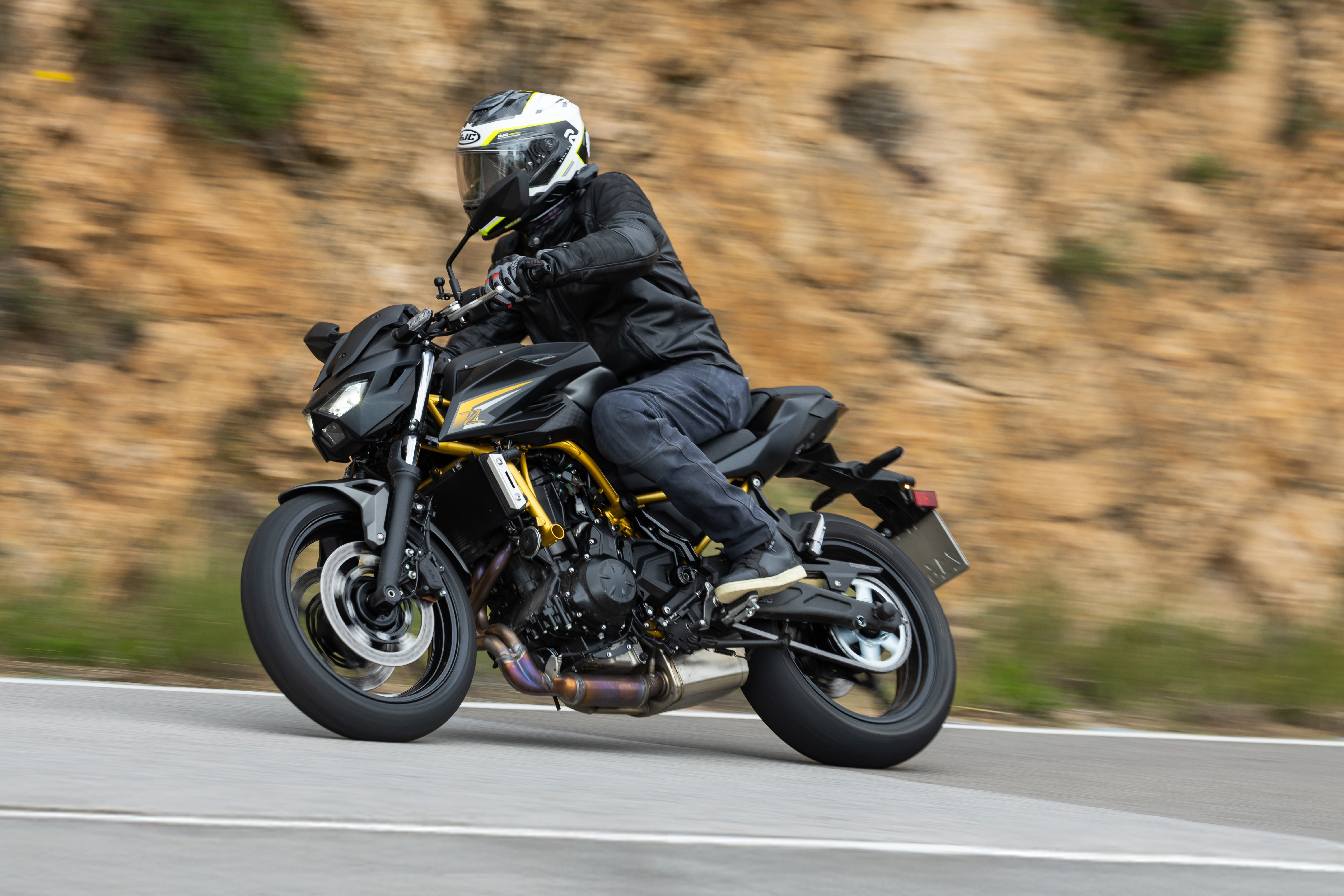Son angle de colonne de 24°, une chasse de 100 mm et un empattement réduit -1 410 mm - assure une bonne compacité à la machine. Dénuée de réglage, la fourche télescopique KYB de 41 mm débat sur 125 mm. Mimant un élément semi-banane, le bras oscillant ajouré en alu (seulement 4,8 kg) confie ses mouvements, sur seulement 130 mm de course, à un amortisseur de même origine, ajustable en précharge uniquement, mais monté sur biellettes. Sa configuration de type Backlink, presque horizontale, contribue à la centralisation des masses. Valorisante, en style la Z650 S soigne l’essentiel : habillage, matériaux, soudure du cadre. Le moteur aurait mérité des carters plus séduisants, mais toutes les surfaces métalliques sont soignées. L’intervalle de maintenance est, depuis 2020, porté à 12 000 km sur ce twin. Prête à l’exercice, la Kawa avoue un poids de forme de 190 kg prête à rouler.