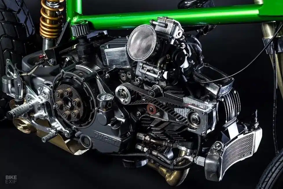 Le résultat ? Une moto qui ressemble à un BMX sous stéroïdes, animée par un moteur Ducati amputé d’un cylindre… et capable de servir du whisky écossais. Oui, vraiment.