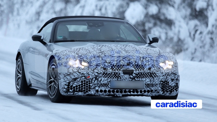 La Mercedes-AMG SL dispose actuellement en entrée de gamme d’un moteur quatre cylindres 2 litres à hybridation légère 48 V qui développe 421 ch et d’un V8 4 litres de 585 ch, le même V8 est disponible en version hybride rechargeable de 816 ch (612 ch pour le bloc thermique + 204 ch pour l’électromoteur). Si cette offre de motorisations devait être conservée avec le modèle restylé, il se peut que dans l’habitacle il y ait des changements d’importance. Nos chasseurs de scoop nous ont en effet indiqué que l’habitacle était entièrement camouflé. Il est possible que d’ici à 2027, année de la présentation de ce modèle, les ingénieurs modifient totalement le tableau de bord de ce cabriolet pour qu’il adopte l’équipement Hyperscreen. Il s’agit d’un panneau numérique complet (trois écrans) qui prend place sur toute la longueur de la planche de bord. Associé au système d’infodivertissement MBUX, le roadster Mercedes-AMG SL serait ainsi équipé du top de la technologie numérique.