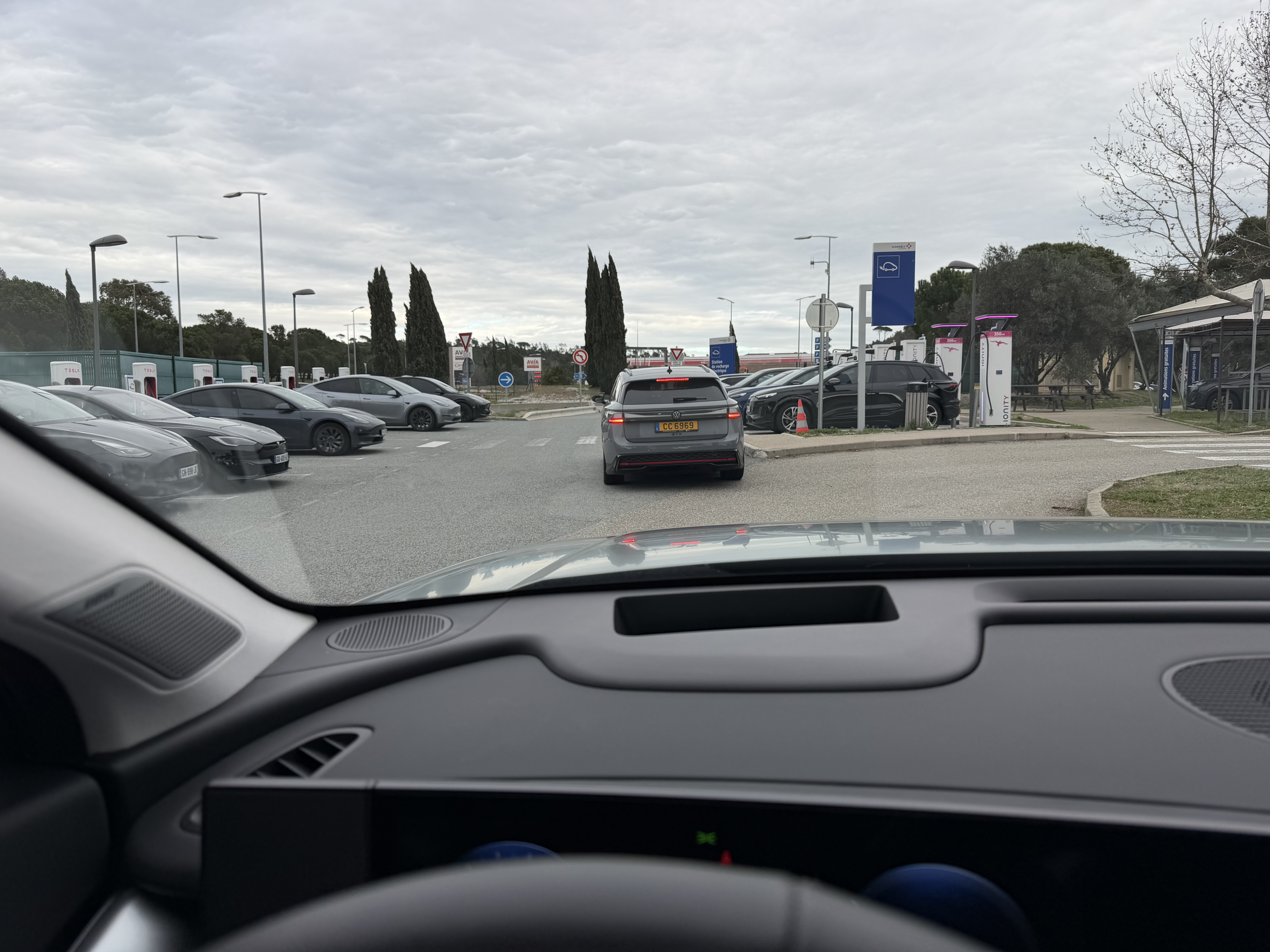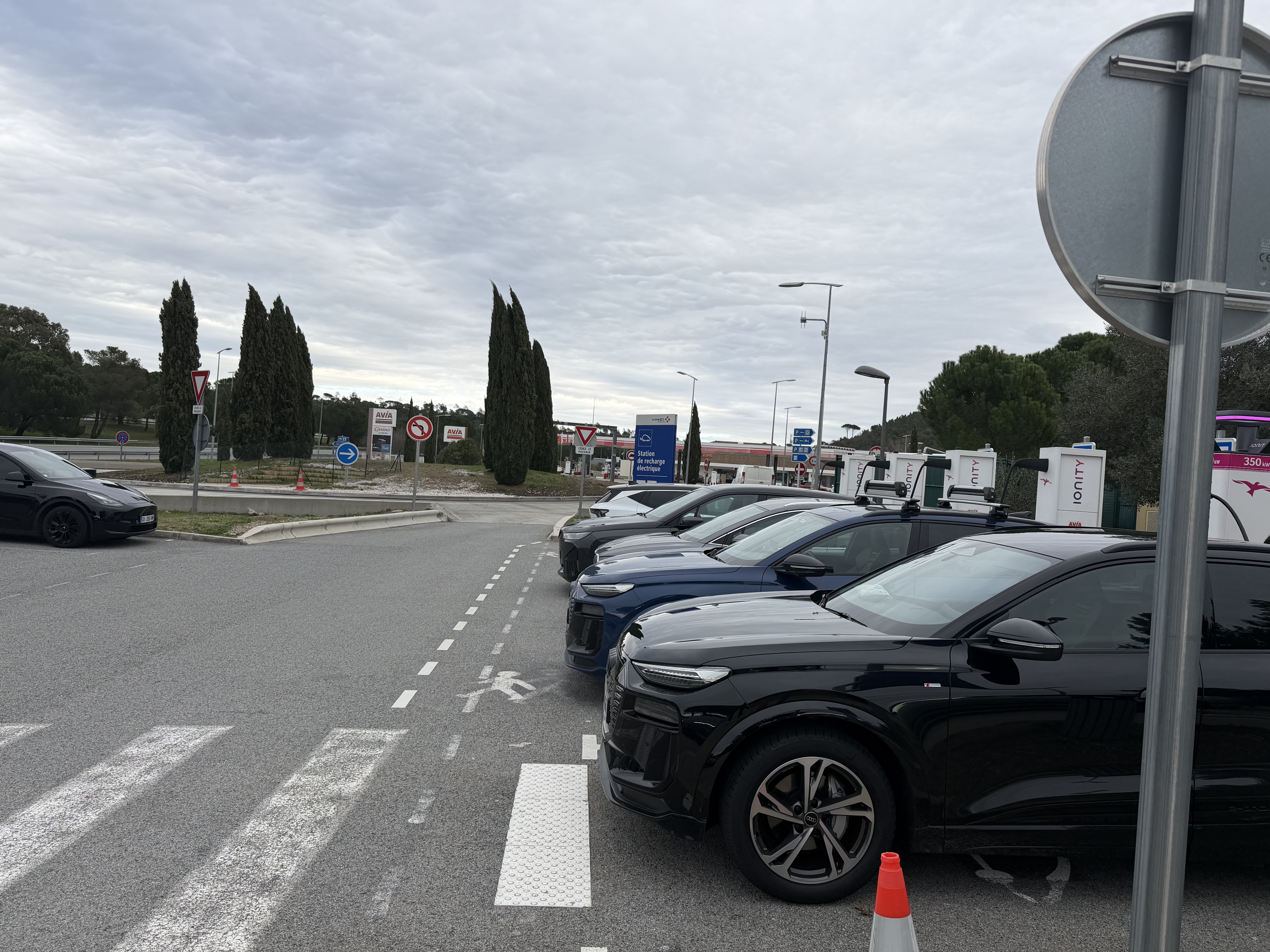 Une fois arrivé, surprise : je suis loin d’être tout seul. Il n’y a hélas que six bornes Ionity à 350 kW sur cette aire de Vidauban Sud et elles sont toutes occupées contrairement à ce qu’indiquait mon application ChargeMap. Une Volkswagen ID.7 attend déjà son tour devant moi mais je me dis qu’une ou deux places se libèreront vite puisqu’en moyenne, il ne faut pas rester plus de 30 minutes pour passer de 10 à 80 % avec les autos électriques présentes sur place (une Peugeot E-208, un BMW iX, deux Audi Q6 e-tron, un Skoda Enyaq et un Renault Scénic).