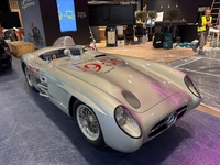 Surtout, Mercedes expose un exemplaire de sa 300 SLR de course (type W196 S) de 1955, cette authentique Formule 1 carrossée. Il ne s’agit pas de la variante fermée « Uhlenhaut », existant en deux exemplaires seulement, qui a battu le record absolu de valeur automobile en 2022 avec ses 135 millions d’euros.