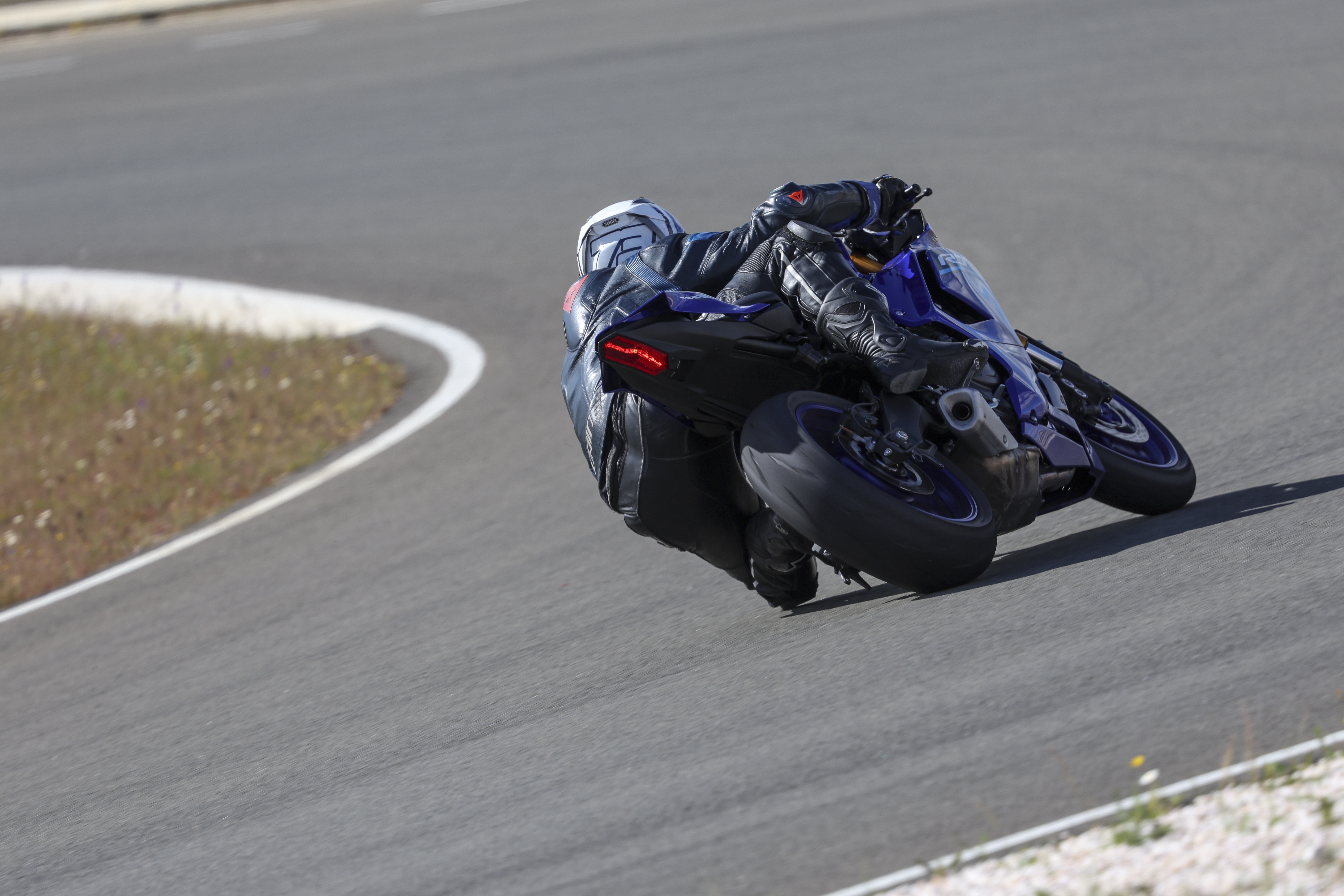 Dans cet environnement où le pneu avant se retrouve régulièrement délesté de ses appuis, on découvre la grande facilité de la R7, sa capacité à s’accorder à merveille avec des gommes pistardes et surtout à prendre très gros angle pour s’y montrer stable. Mieux encore, on conserve la possibilité de corriger la trajectoire : elle est permissive tant que l’on ne la pousse pas dans ses retranchements. Là, une fois en mains et mémorisé le tracé, elle est redoutable à condition de ne pas aller chercher les limites du pneu en désactivant les assistances, notamment en fin de journée, où les sessions enchaînées par les gommes commencent à laisser l’arrière dériver plus fort, plus facilement.