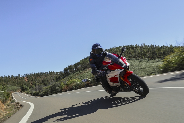 C’est le tout récent et inédit Circuito Do Sol, au Portugal, une sorte de Portimao situé non loin de Beja, que nous nous sommes rendus pour découvrir la moto sous son jour le plus sportif. Là, sur un tracé de 3,5 km en forme de pièce de puzzle proposant 23 virages, sont 18 à gauche et 5 à droite, reprenant le Corkscrew de Laguna Seca, l’Eau Rouge de Spa, et les enchaînements Porsche du Mans, nous l’avons rapidement surnommé « Portiminimao » tant les sensations étaient… Pires. Vallonné, avec la quasi-totalité de ses virages en aveugle et d’une vacherie redoutable, sans parler des dégagements limités, nous avons découvert un tracé sensationnel totalement adapté à une moto de petite ou moyenne cylindrée. La R7 y était-elle à l’aise ?