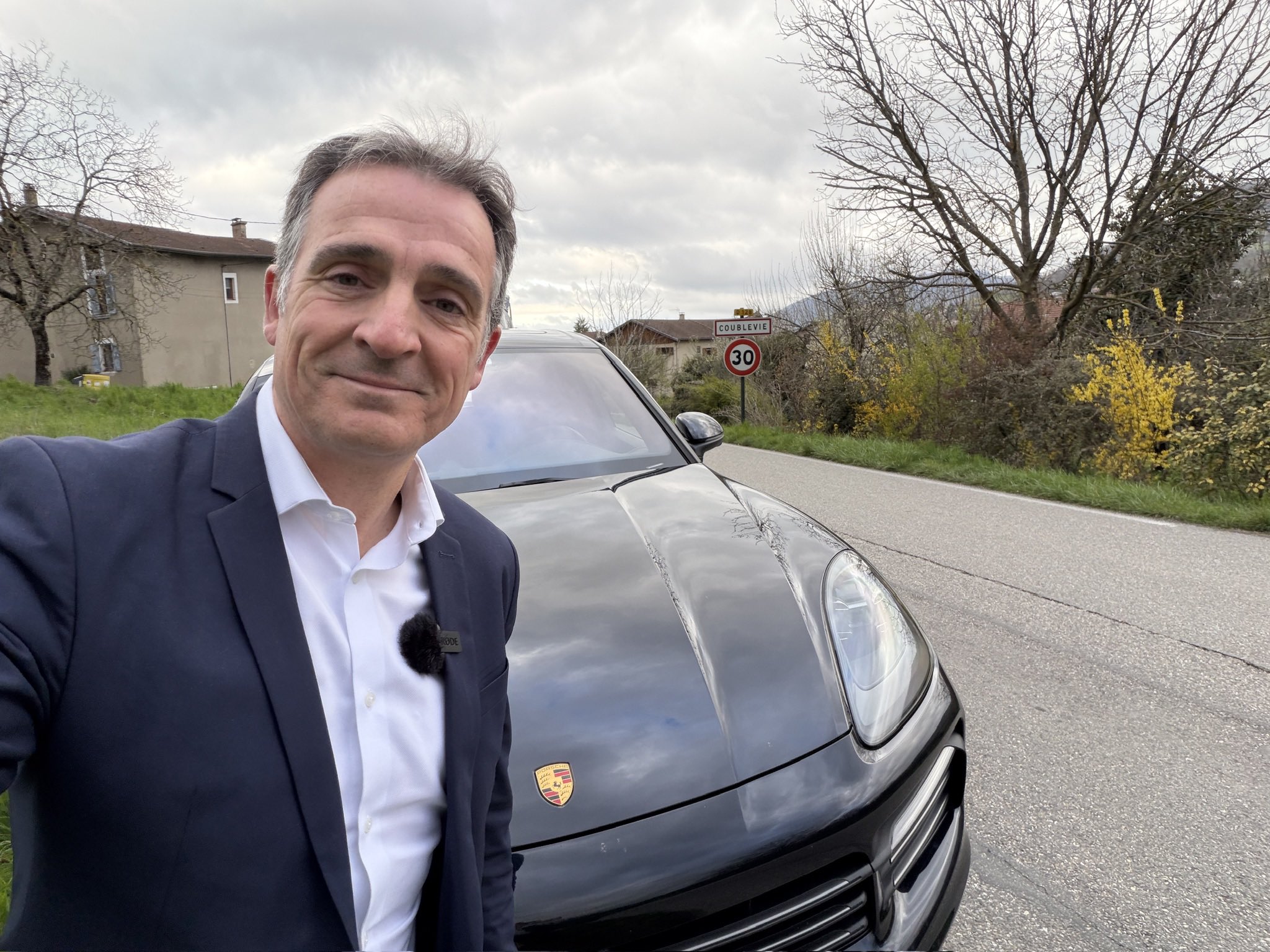 Pour le 1er avril 2026 et alors qu’il n’est plus le maire de Grenoble, il en a remis une couche avec davantage de moyens : c’est bien lui qu’on voit poser à côté d’un authentique Porsche Cayenne de troisième génération, sortant du coffre un vélo qu’il n’enfourche que pour faire croire qu’il utilise ce moyen de locomotion vert et pas son puissant SUV allemand.