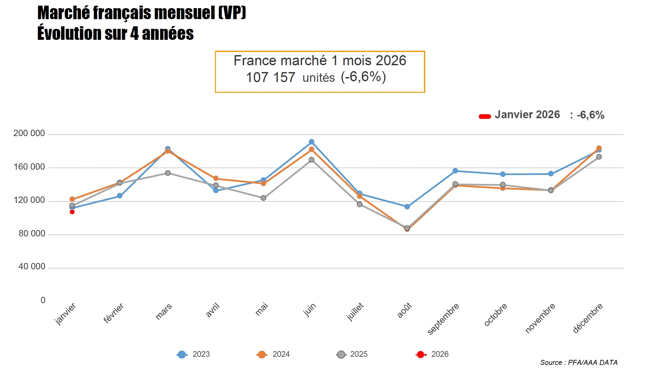 Avec 107 157 voitures neuves particulières écoulées sur le mois de janvier 2026, le marché signe un repli de 6,6 % par rapport au même mois de l’année précédente. Si l’on compare à nombre de jours ouvrés identique, heureusement, la chute n’est plus que de 2,1 % ce qui reste un très mauvais chiffre.