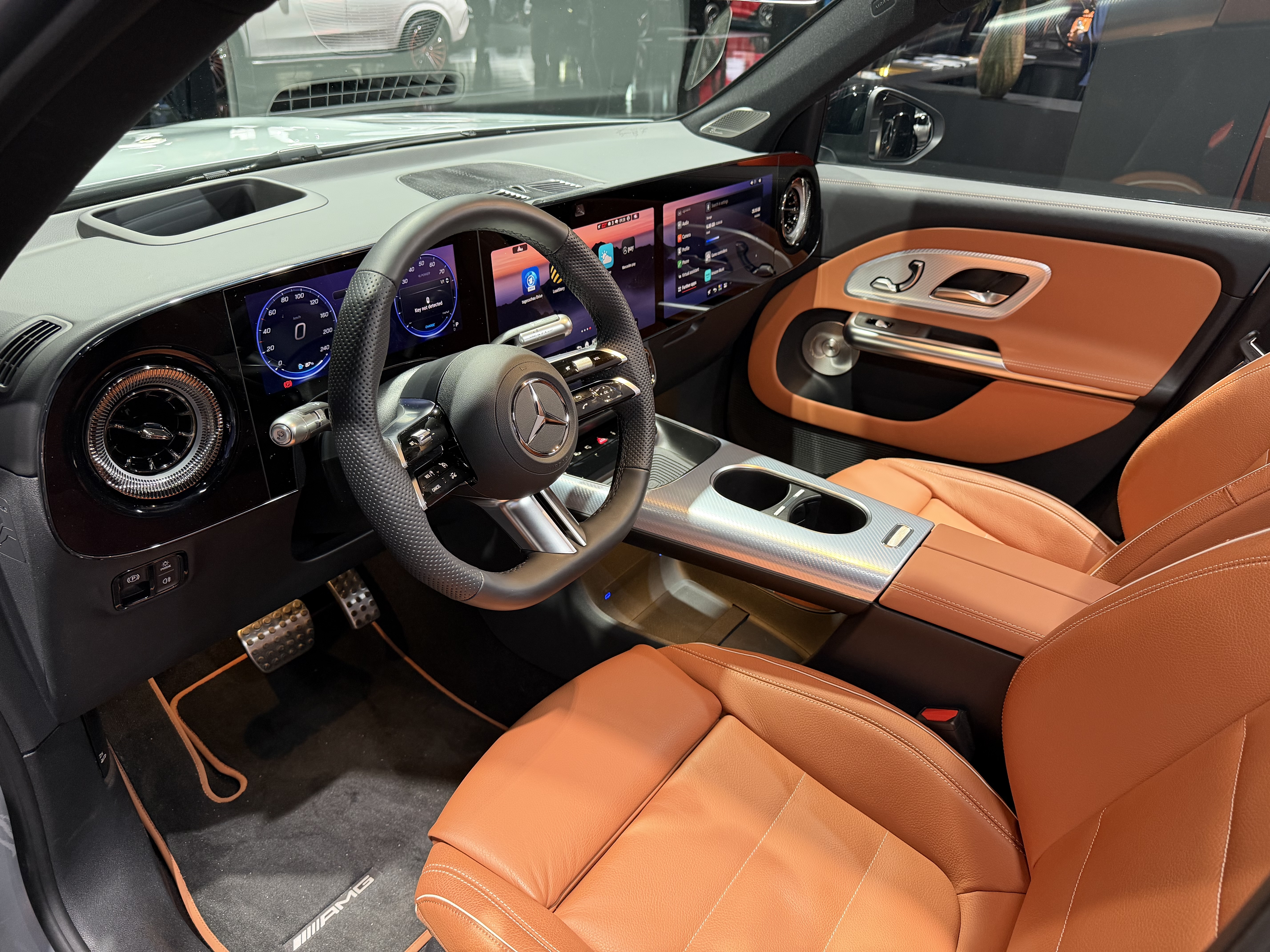A l’intérieur, le GLB reprend la planche de bord de la récente CLA avec son écran de 10,25 pouces sur le combiné d’instrumentation et ses deux écrans de 14 pouces au centre et devant le passager. Dans la finition haut de gamme de l’exemplaire exposé sur le stand de Mercedes au salon de Bruxelles, le cuir qui tapisse l’habitacle est magnifique et il y a une vraie impression de luxe qui s’en dégage.