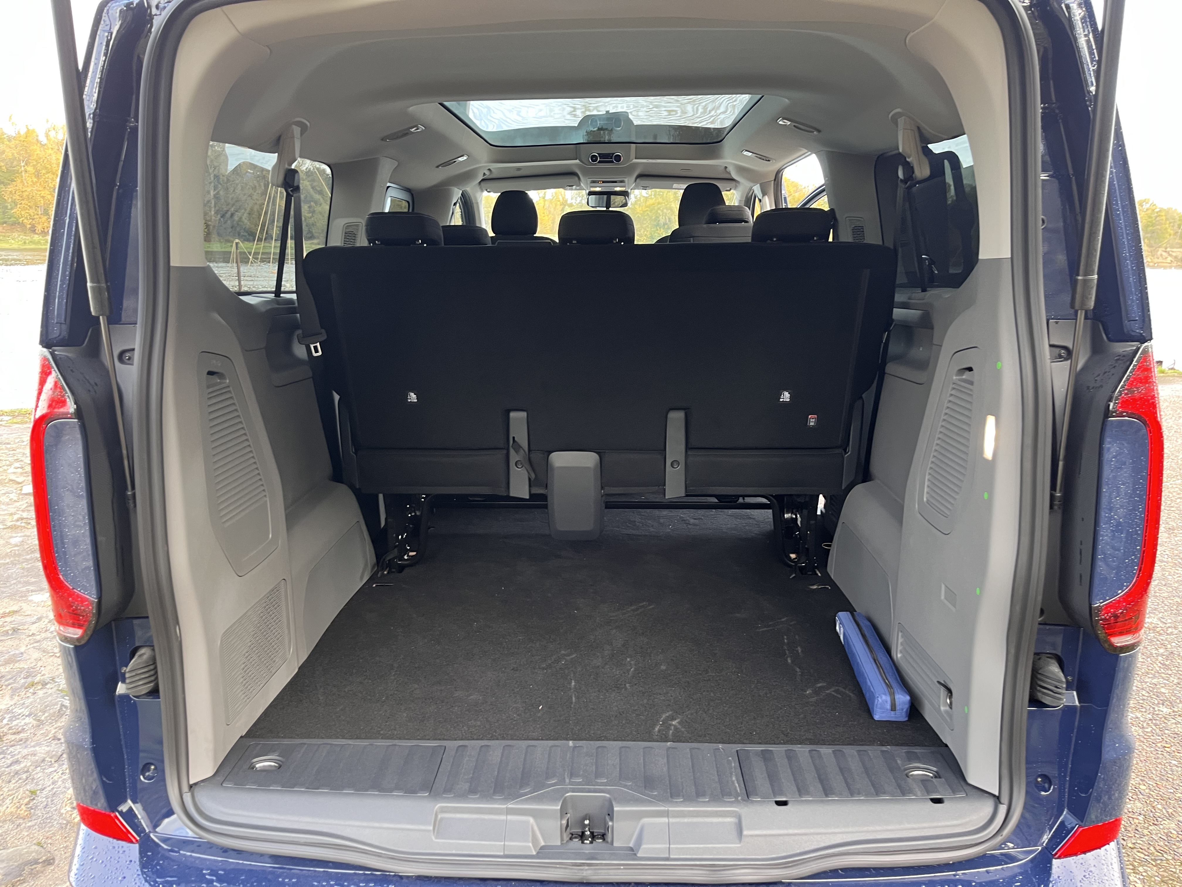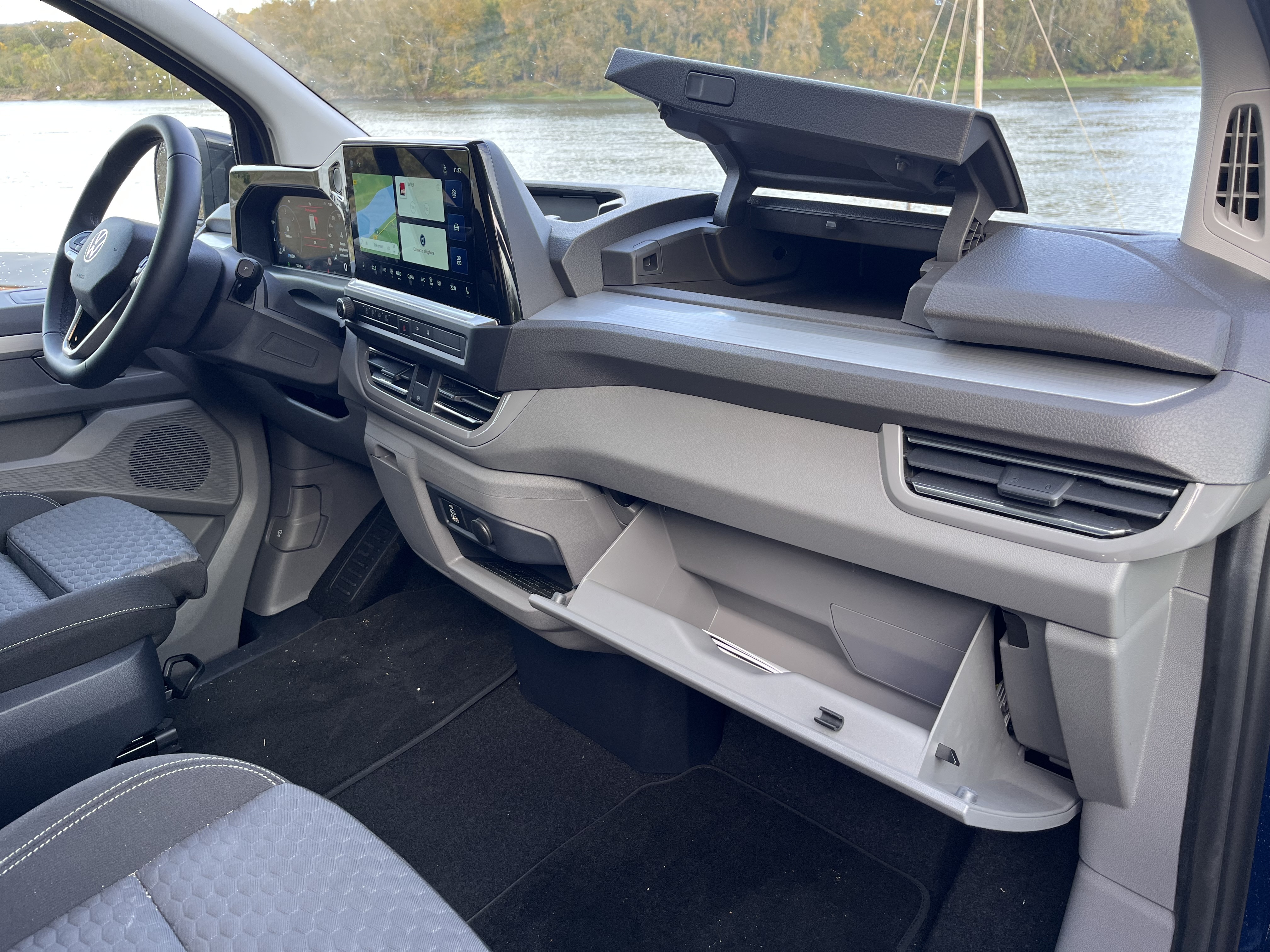 La septième version du Transporter n’y échappe pas avec cette version à 9 places au maximum, selon la combinaison choisie. Nous avons donc joué au chauffeur sans clients et sans enfants d’un modèle à 8 places et trois rangées de sièges. De quoi caser un maximum de monde et leurs bagages, puisque le coffre jauge près de 1000 l, sièges en place. Pas de faute de frappe dans ce chiffre, c’est dire l’habitabilité de l’engin de 5,45m, puisqu’il est basé sur la version L2 du T7.