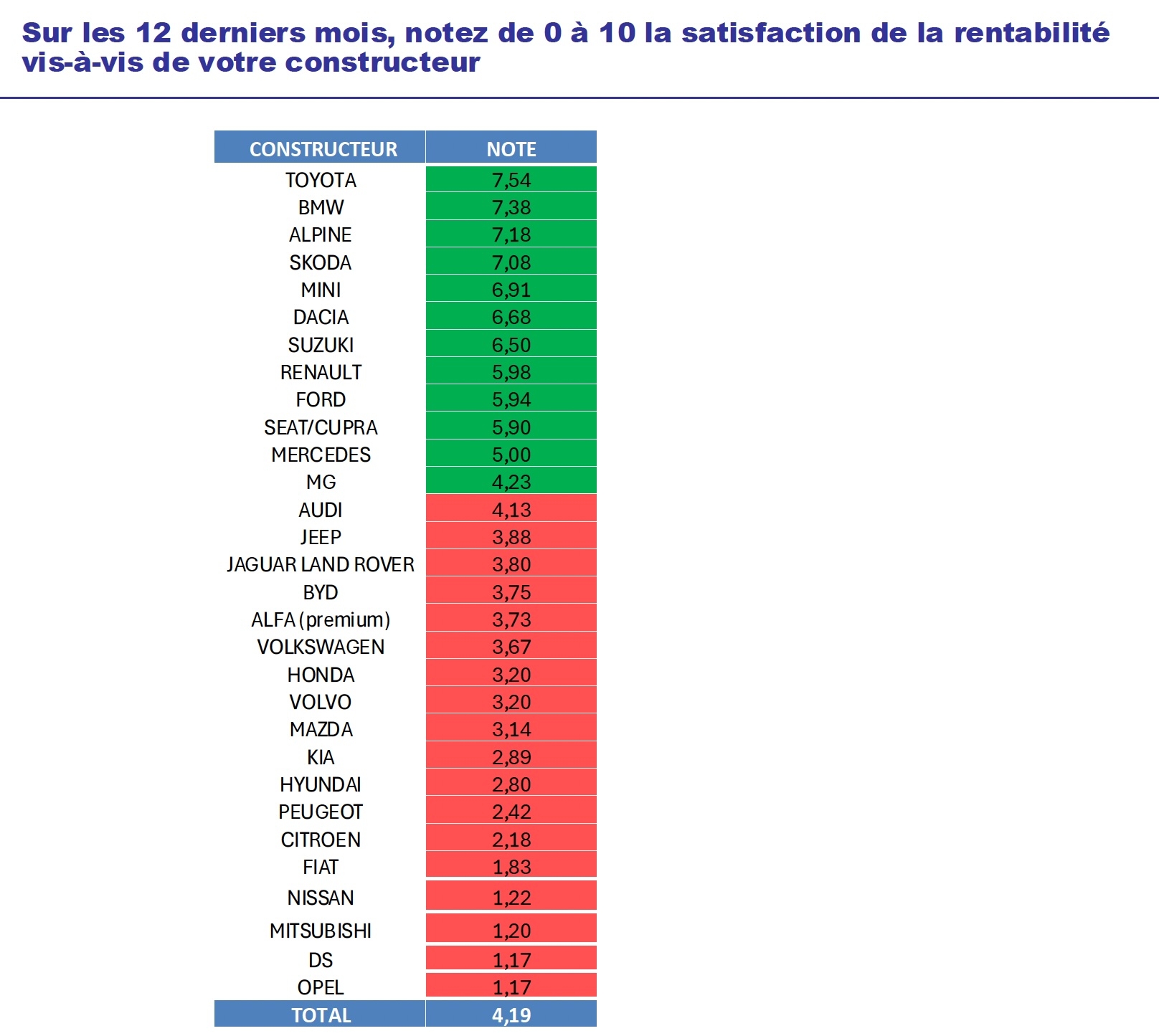 Il est aussi intéressant de noter que MG, marque dans laquelle les concessionnaires français déclaraient vouloir investir il y a quelques années, n’est plus aussi bien perçu aujourd’hui. Alors que le constructeur du groupe SAIC a étendu son réseau à un très bon niveau, les répondants ne sont plus que 3,6 % à vouloir investir dans cette marque. Les professionnels de la vente travaillant avec MG ne sont que 10 % à être « confiants dans l’avenir de la marque » et MG n’obtient plus que 4,35 % de note générale dans la Cote d’Amour (4,23 pour la rentabilité).