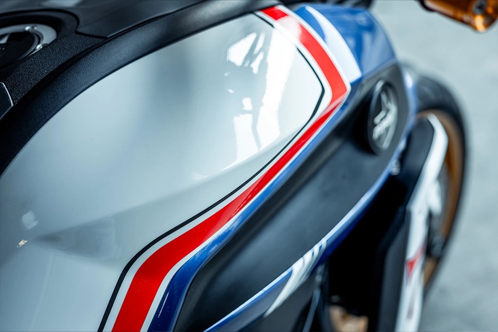 Pour la préparation, la selle a été confiée à la Sellerie Briant, avec un mélange de textures lisses et perforées pour un grip parfait en mode sport. Des jantes dorées, des plaques numéro « 750 » vintage sur les flancs de radiateur, et un guidon rouge rehaussent le style général.