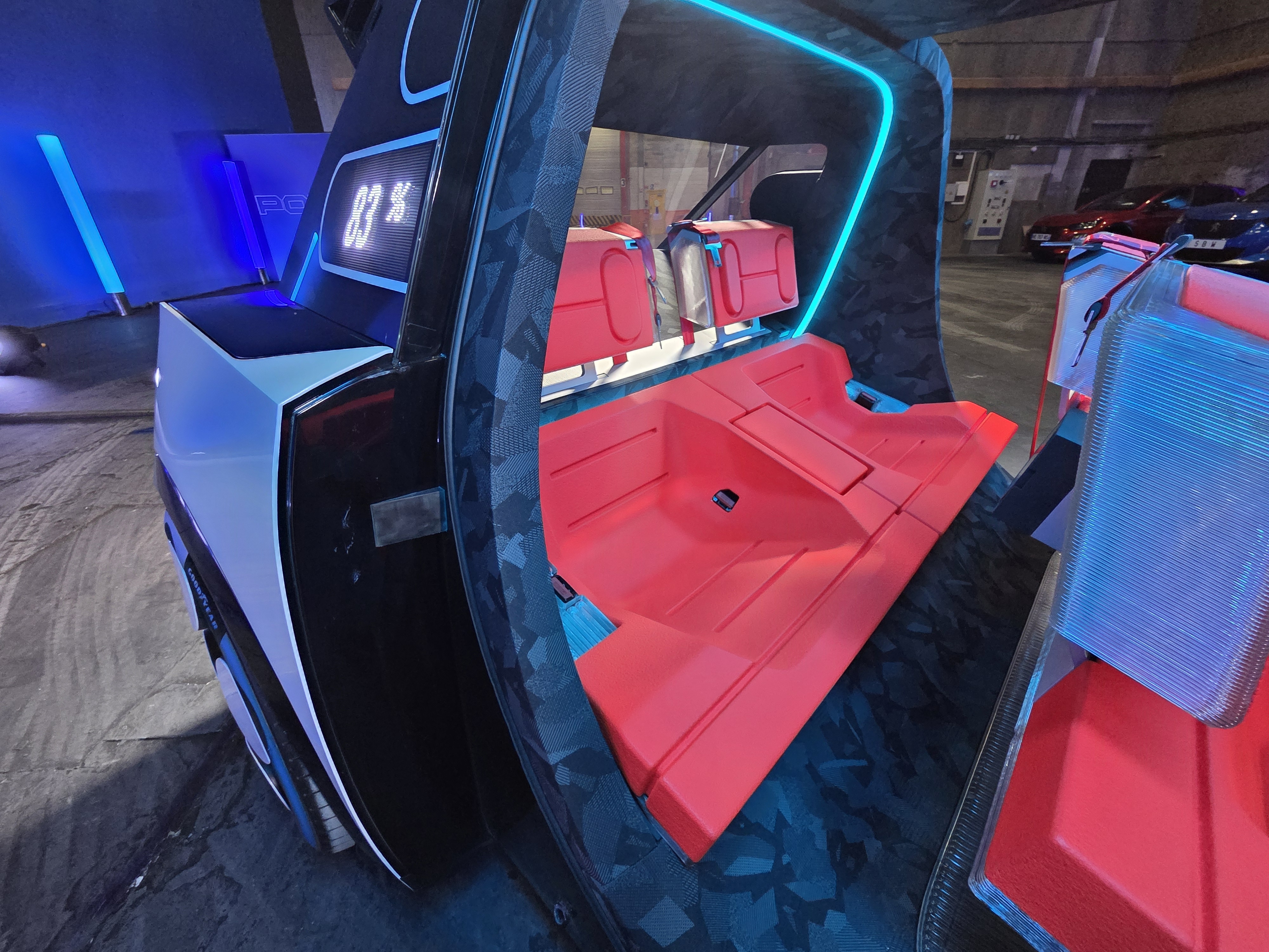 Le plus incroyable, dans ce concept, c’est que le dessin extérieur, pour le moins original, n’est pas l’élément le plus iconoclaste. À bord du Polygon, on perd, en effet, tous ses repères. Et cela commence dès les portes ouvertes. On découvre des sièges aux formes aussi enveloppantes que celles d’une baignoire, avec un dossier très court et des appuie-tête imposants. De prime abord, ils donnent l’impression d’être aussi durs que la baignoire précitée. Et pourtant, la mousse qui habille la coque imprimée en 3D, et qui est monobloc, s’adapte parfaitement aux formes du conducteur et de ses passagers. Du moins, durant un essai de quelques dizaines de minutes. Si cette solution était retenue pour la série, il faudrait, naturellement, la mettre à l’épreuve d’un long trajet.