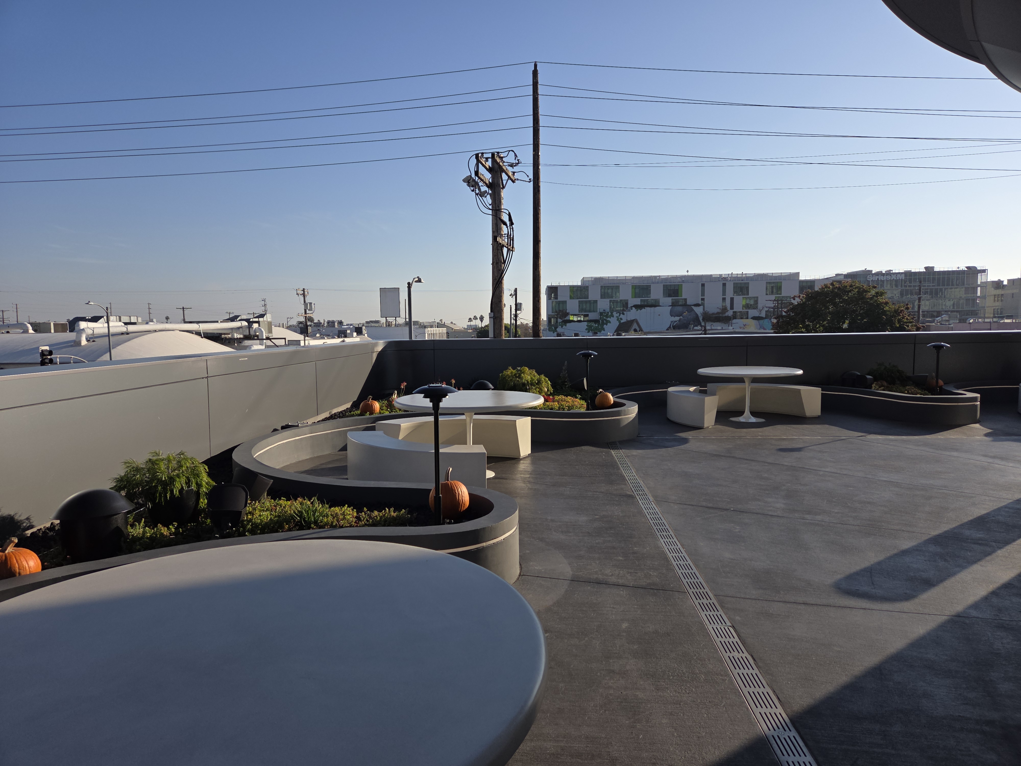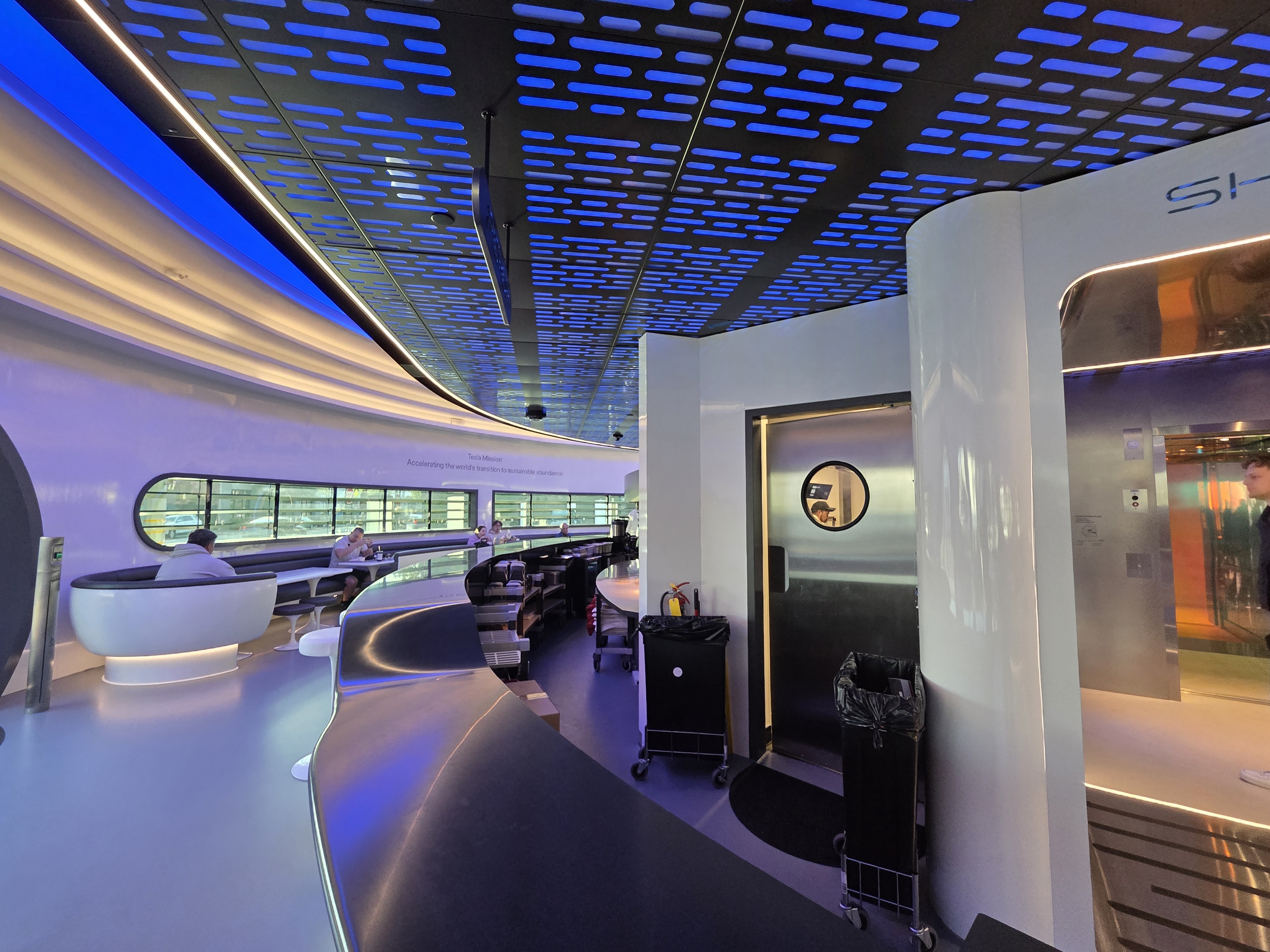 À l’intérieur, le blanc laqué règne en maître, aux côtés d’éclairages aux coloris pastel. S’il n’y avait pas les larges baies vitrées qui donnent sur le boulevard, on pourrait aisément se croire à bord d’un vaisseau spatial. Un vaisseau XXL puisque pas moins de 250 passagers, pardon, convives, peuvent y déjeuner simultanément, à l’intérieur ou sur le large rooftop qui permet de profiter du soleil californien.
