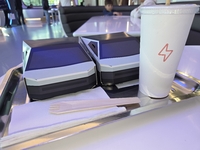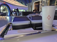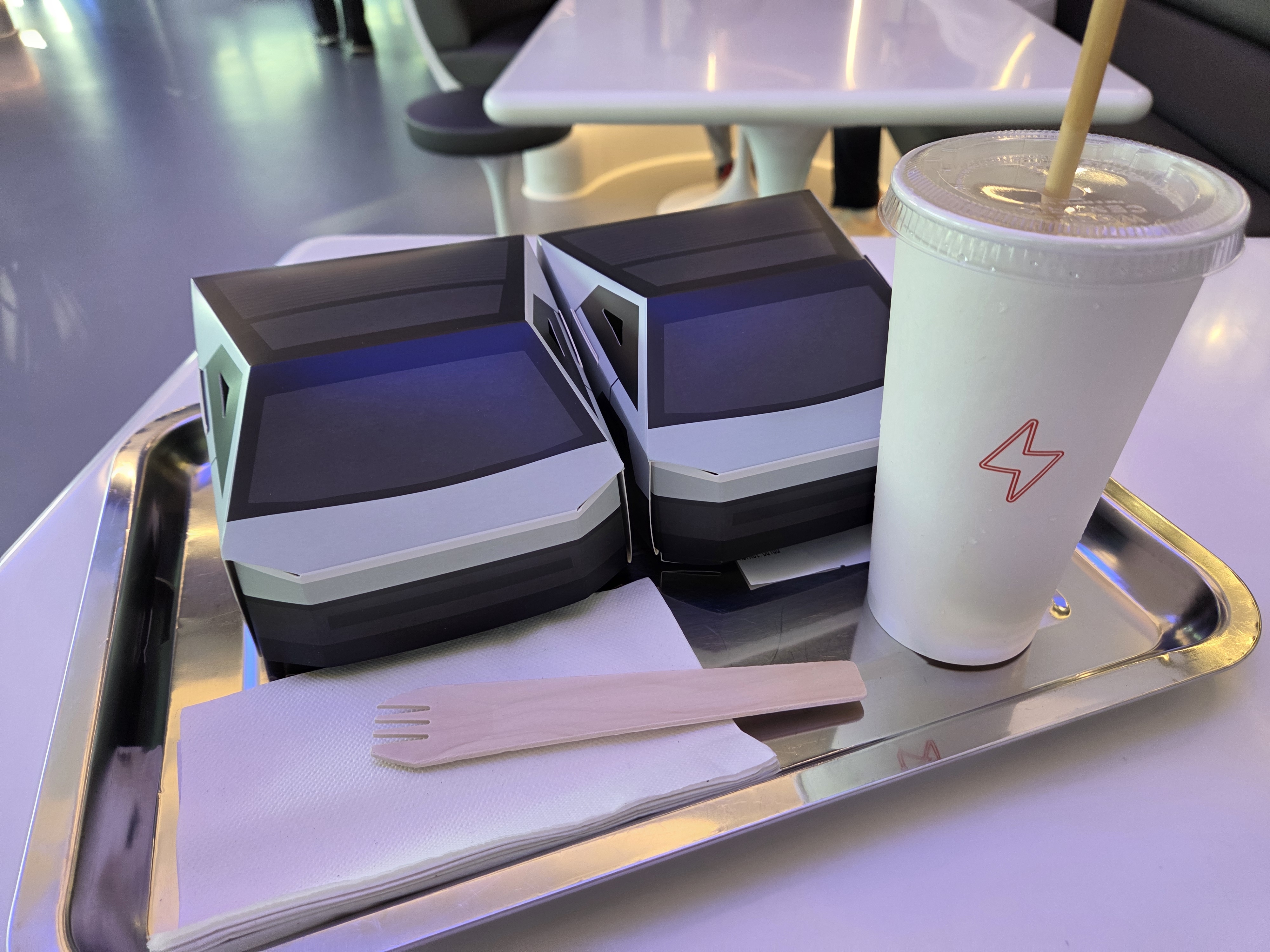 Il est temps de passer à table. Le menu est lui aussi typiquement américain avec des classiques de la "gastronomie" d’outre-Atlantique revisités à la sauce Tesla, tels que le V2G Egg Sandwich, l’Autopilot Avocado Toast ou encore le 500 kW Chia Pudding.