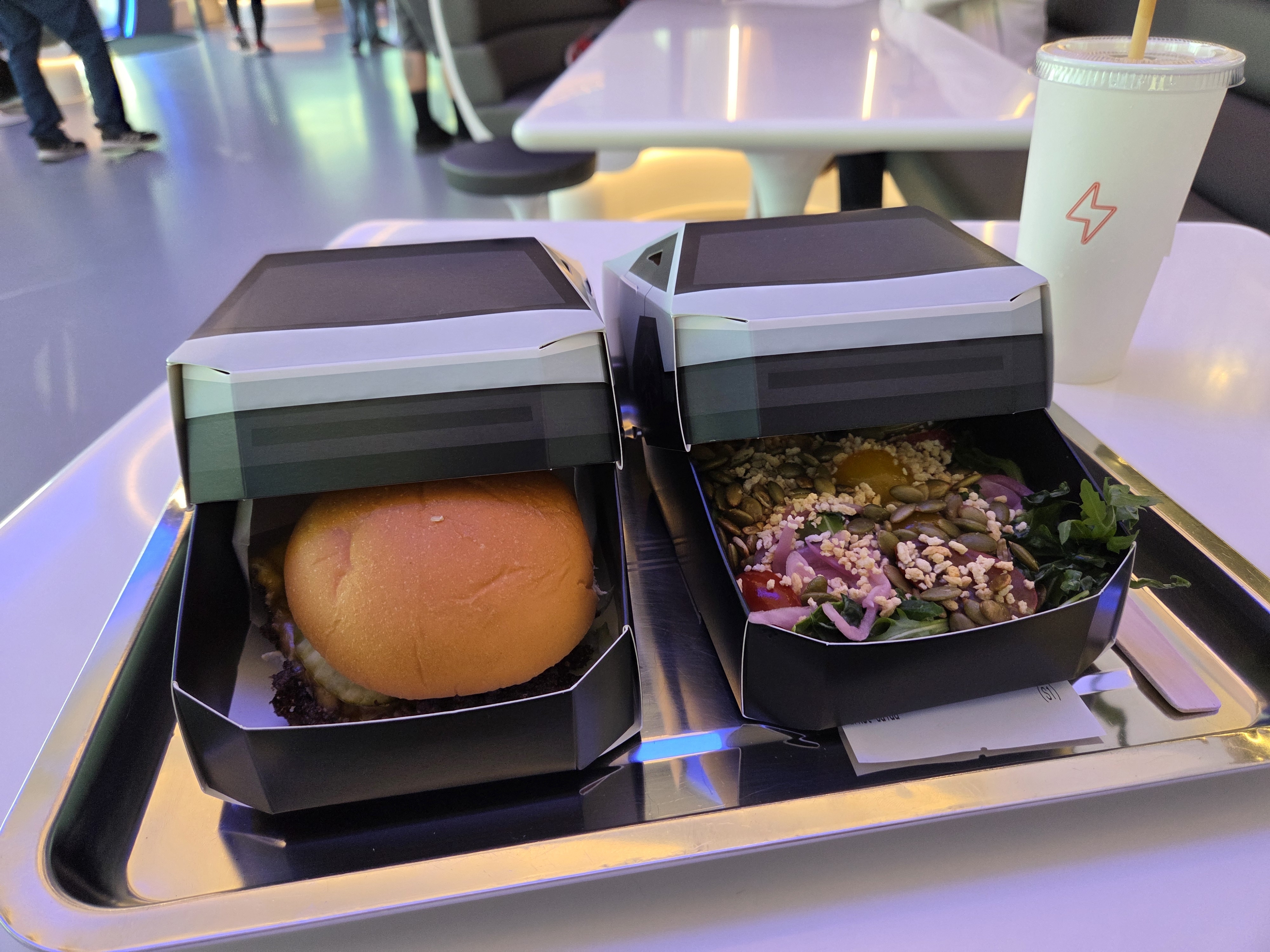 Pour notre part, ce sera un Tesla Giga Burger et une Market Salad. À première vue, la seule originalité de ces plats est d’être servi dans des boîtes au look de Cybertruck, le pick-up du constructeur. Mais, même si nous n’avons nullement la prétention d’avoir le talent d’un critique gastronomique, l’ensemble nous a paru goûteux et frais. Un challenge que relèvent assez peu de restaurants au royaume du fast-food. D’autant que, bonne surprise, l’addition s’est avérée digeste.