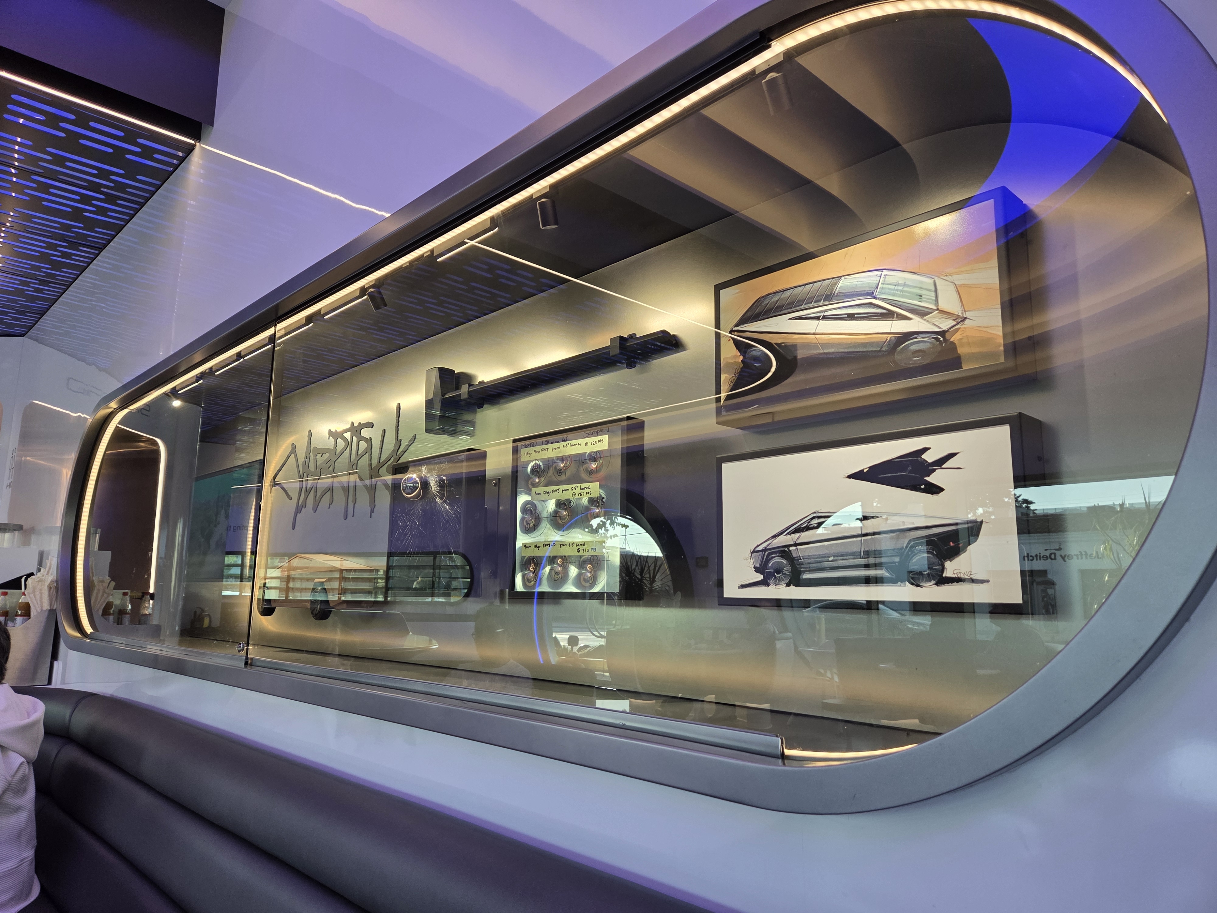 Dès le parking, ce qui surprend également, ce sont les deux immenses écrans, de 20 m de diagonale chacun, sur lesquels sont diffusés grands classiques du cinéma hollywoodien, séries iconiques ou encore des événements spéciaux. Car le Tesla Diner veut aussi remettre à la mode le concept du Drive-In, ces cinémas dans lesquels on restait installé dans sa voiture. Pour pousser l’idée jusqu’au bout, il est possible de télécharger, si l’on possède une Tesla, naturellement, l’application Tesla Diner qui permet d’obtenir la bande sonore du film projeté, mais également de commander à manger à l’équipe du Tesla Diner qui se chargera de vous livrer directement à votre auto.