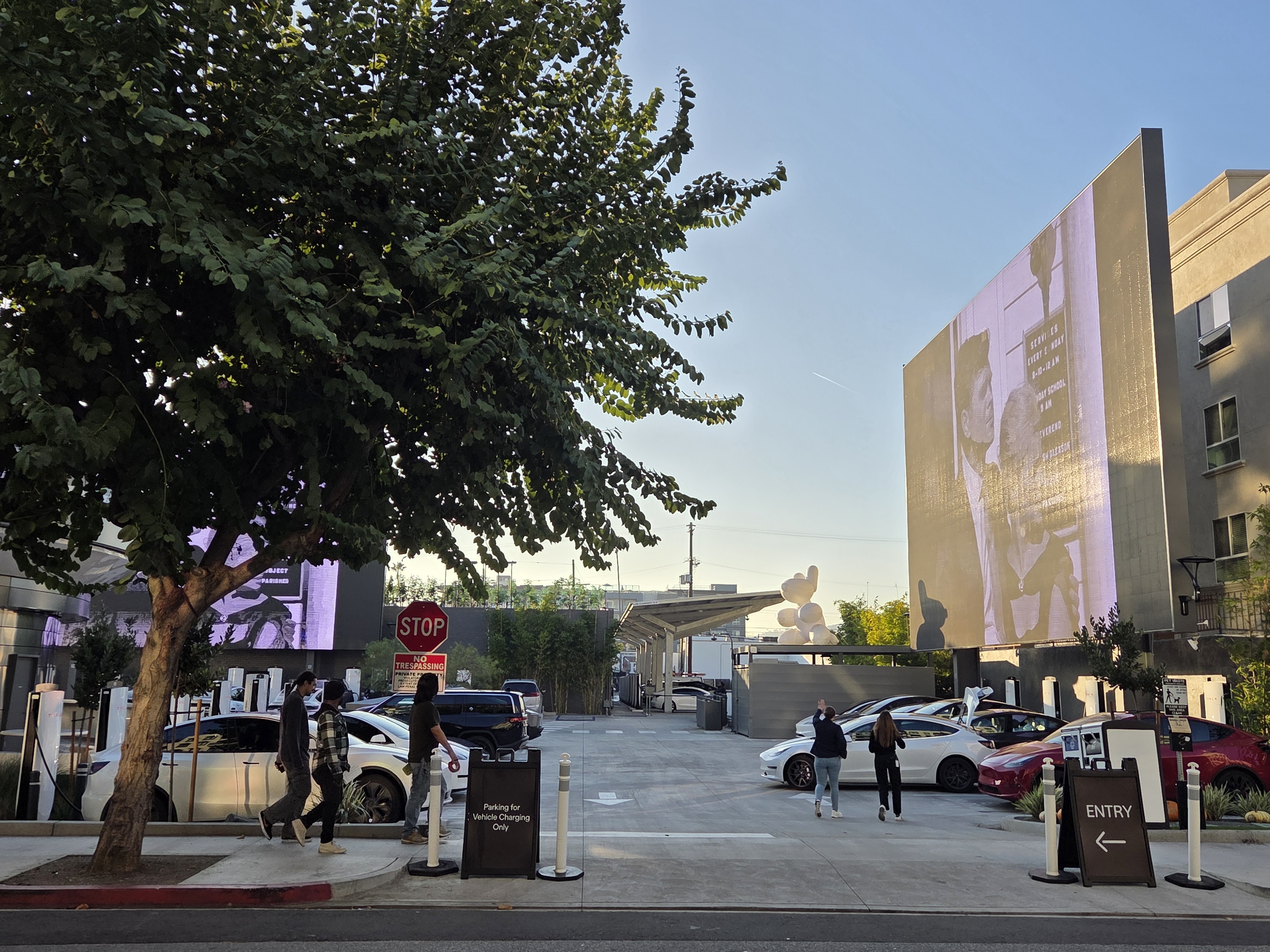 Outre l’emplacement en lui-même, situé le long de ce qui fut la mythique Route 66, c’est sa surface qui a sans doute tapé dans l’œil des initiateurs de ce projet. Ils ont ainsi réussi à transformer le parking en la plus grande station urbaine de Superchargeurs au monde : 80 véhicules, et pas seulement des Tesla puisque ces bornes sont accessibles à les tous les véhicules électriques compatibles NACS, le standard Tesla. Une partie d’entre elles est recouverte de panneaux photovoltaïques.