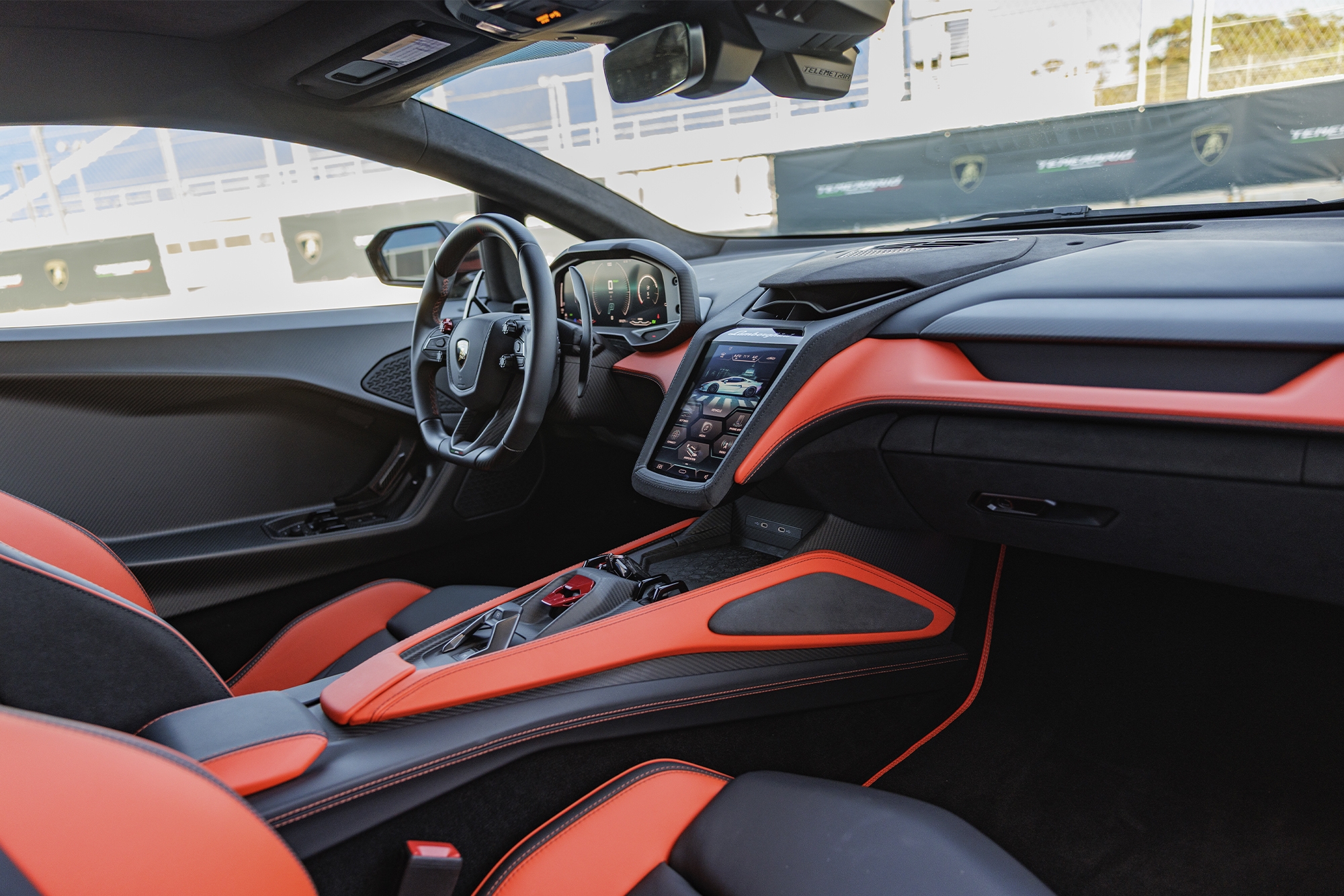 Une fois installé à bord de cette berlinette à moteur central arrière équipées de portières à l’ouverture « normale » (le système en élytre se réserve toujours aux Lamborghini V12), en revanche, il n’y a absolument aucun étonnement lorsqu’on connaît déjà la Revuelto : de la planche de bord jusqu’à l’ergonomie générale des commandes, tout semble presque identique ici. Le style « guerrier » comprend trois écrans et une qualité de finition irréprochable (surtout si vous optez pour les très beaux cuirs du catalogue de personnalisation), mais l’ambiance peut paraître à la fois un peu terne et inélégante selon la configuration choisie. L’habitabilité progresse en tout cas par rapport à la Huracan, avec une garde au toit qui n’empêchera plus les très grands gabarit de prendre place à bord. Il faut dire que l’auto grossit beaucoup en longueur par rapport à la Huracan, à 4,70 mètres contre 4,46 mètres pour sa devancière (et 4,3 mètres seulement pour la Gallardo !).