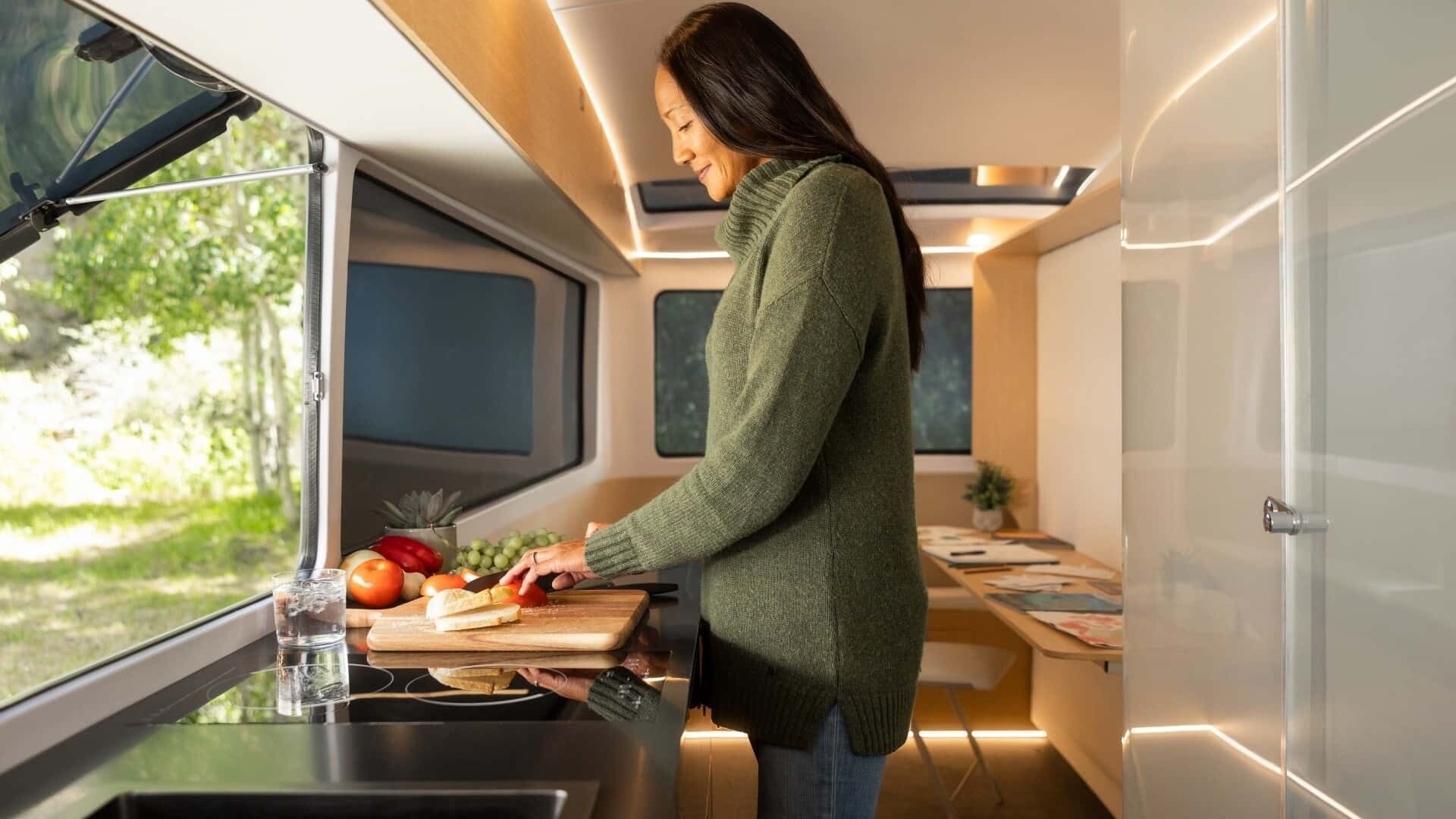 Avec la Flow, plus de souci. Une appli sur la tablette fournie, un bouton, un appui et c’est parti. La caravane se détache de l’auto, recule toute seule et se met en place à l’emplacement qu’on lui désigne. Elle se place automatiquement de manière bien horizontale et sa batterie devient alors l’alimentation de l’habitation roulante avec ses lumières, ses prises de courant, son eau chaude, et ses plaques à induction (pour la popote évidemment). L’arrimer à son auto pour regagner le sweet home est tout aussi simple : la caravane s’en charge toute seule.